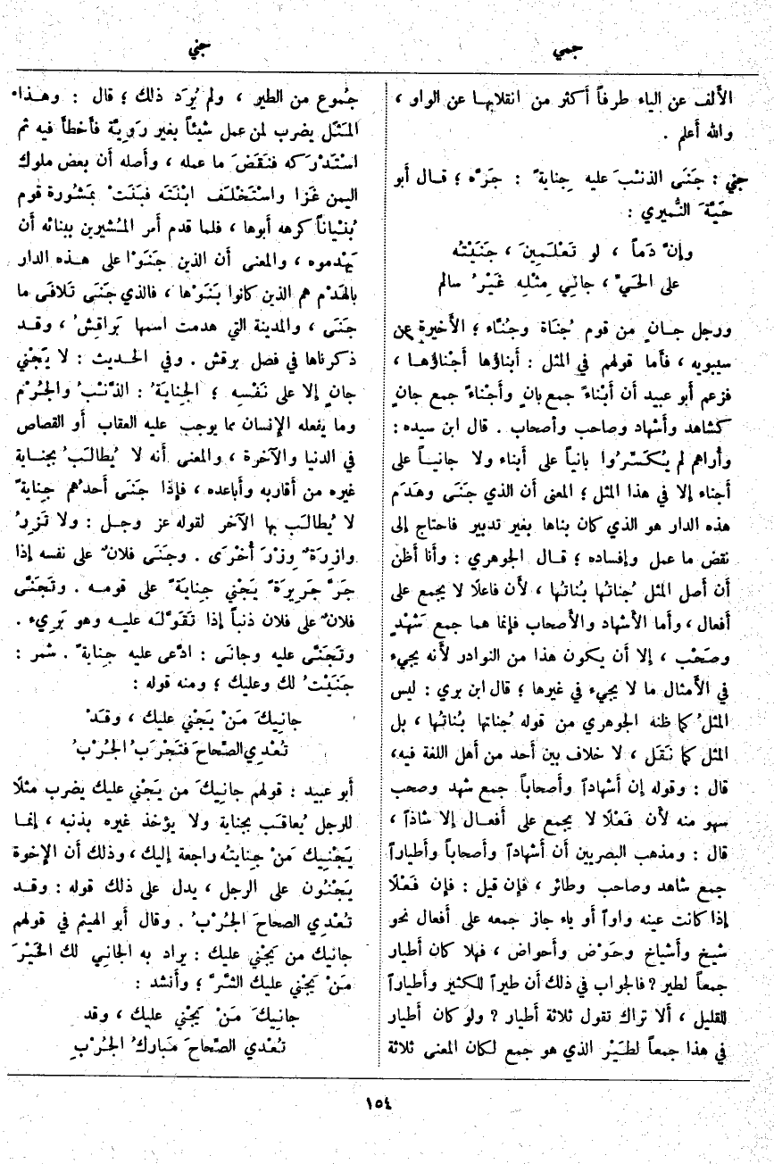وَرَجُلٌ جَانٍ مِنْ قَوْمٍ جُنَاة وجُنَّاء، الأَخيرة عَنْ سِيبَوَيْهِ، فأَما قَوْلُهُمْ فِي الْمَثَلِ: أَبناؤُها أَجْناؤُها، فَزَعَمَ أَبو عُبَيْدٍ أَن أَبناءً جَمْعُ بانٍ وأَجْنَاءً جَمْعُ جَانٍ كَشَاهِدٍ وأَشهاد وَصَاحِبٍ وأَصحاب. قَالَ ابْنُ سِيدَهْ: وأُراهم لَمْ يُكَسِّرُوا بَانِيًا عَلَى أَبناء وَلَا جَانِياً عَلَى أَجْنَاء إِلَّا فِي هَذَا الْمَثَلِ، الْمَعْنَى أَن الَّذِي جَنَى وهَدَم هَذِهِ الدَّارَ هُوَ الَّذِي كَانَ بَنَاهَا بِغَيْرِ تَدْبِيرٍ فَاحْتَاجَ إِلَى نَقْضِ مَا عَمِلَ وإِفساده، قَالَ الْجَوْهَرِيُّ: وأَنا أَظن أَن أَصل الْمَثَلِ جُنَاتُها بُناتُها، لأَن فَاعِلًا لَا يُجْمَعُ عَلَى أَفعال، وأَما الأَشهاد والأَصحاب فإِنما هُمَا جَمْعُ شَهْدٍ وصَحْب، إِلَّا أَن يَكُونَ هَذَا مِنَ النَّوَادِرِ لأَنه يَجِيءُ فِي الأَمثال مَا لَا يَجِيءُ فِي غَيْرِهَا، قَالَ ابْنُ بَرِّيٍّ: لَيْسَ المثلُ كَمَا ظَنَّهُ الْجَوْهَرِيُّ مِنْ قَوْلِهِ جُنَاتها بُناتُها، بَلِ الْمَثَلُ كَمَا نَقَل، لَا خِلَافَ بَيْنِ أَحد مِنْ أَهل اللُّغَةِ فِيهِ، قَالَ: وَقَوْلُهُ إِن أَشهاداً وأَصحاباً جَمْعُ شَهْدٍ وَصَحْبٍ سَهْوٌ مِنْهُ لأَن فَعْلًا لَا يُجْمَعُ عَلَى أَفعال إِلَّا شَاذًا، قَالَ: وَمَذْهَبُ الْبَصْرِيِّينَ أَن أَشهاداً وأَصحاباً وأَطياراً جَمْعُ شَاهِدٍ وَصَاحِبٍ وَطَائِرٍ، فَإِنْ قِيلَ: فإِن فَعْلًا إِذا كَانَتْ عَيْنُهُ وَاوًا أَو يَاءً جَازِ جَمْعُهُ عَلَى أَفعال نَحْوَ شَيْخٍ وأَشياخ وحَوْض وأَحواض، فَهَلَّا كَانَ أَطيار جَمْعًا لِطَيْرٍ؟ فَالْجَوَابُ فِي ذَلِكَ أَن طَيْرًا لِلْكَثِيرِ وأَطياراً لِلْقَلِيلِ، أَلا تَرَاكَ تَقُولُ ثَلَاثَةُ أَطيار؟ وَلَوْ كَانَ أَطيار فِي هَذَا جَمْعًا لطَيْر الَّذِي هُوَ جَمْعٌ لَكَانَ الْمَعْنَى ثَلَاثَةُ جُموع مِنَ الطَّيْرِ، وَلَمْ يُرَد ذَلِكَ، قَالَ: وَهَذَا المَثَل يُضْرَبُ لِمَنْ عَمِلَ شَيْئًا بِغَيْرِ رَوِيَّة فأَخطأَ فِيهِ ثُمَّ اسْتَدْرَكه فنَقَضَ مَا عَمِلَهُ، وأَصله أَن بَعْضَ مُلُوكِ الْيَمَنِ غَزا واسْتَخْلَف ابْنَتَه فبَنَتْ بمَشُورة قَوْمٍ بُنْياناً كَرِهَهُ أَبوها، فَلَمَّا قَدِمَ أَمر المُشيرين بِبِنَائِهِ أَن يَهْدموه، وَالْمَعْنَى أَن الَّذِينَ جَنَوْا عَلَى هَذِهِ الدَّارِ بالهَدْم هُمُ الَّذِينَ كَانُوا بَنَوْها، فَالَّذِي جَنَى تَلافَى مَا جَنَى، وَالْمَدِينَةُ الَّتِي هُدِمَتِ اسْمُهَا بَرَاقِشُ، وَقَدْ ذَكَرْنَاهَا فِي فَصْلِ بَرْقَشَ. وَفِي الْحَدِيثِ: