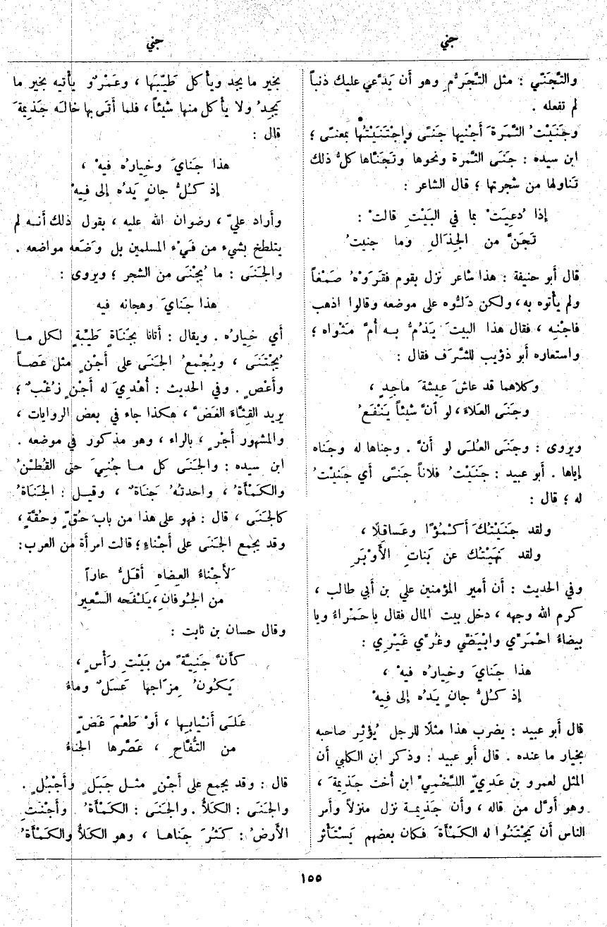 والتَّجَنّي: مِثْلُ التَّجَرُّمِ وَهُوَ أَن يدَّعي عَلَيْكَ ذَنْبًا لَمْ تَفْعَلْهُ. وجَنَيْتُ الثَّمَرةَ أَجْنِيها جَنًى واجْتَنَيْتُها بِمَعْنًى، ابْنُ سِيدَهْ: جَنَى الثَّمرة وَنَحْوَهَا وتَجَنَّاها كلُّ ذَلِكَ تَناولها مِنْ شَجَرَتِهَا، قَالَ الشَّاعِرُ: