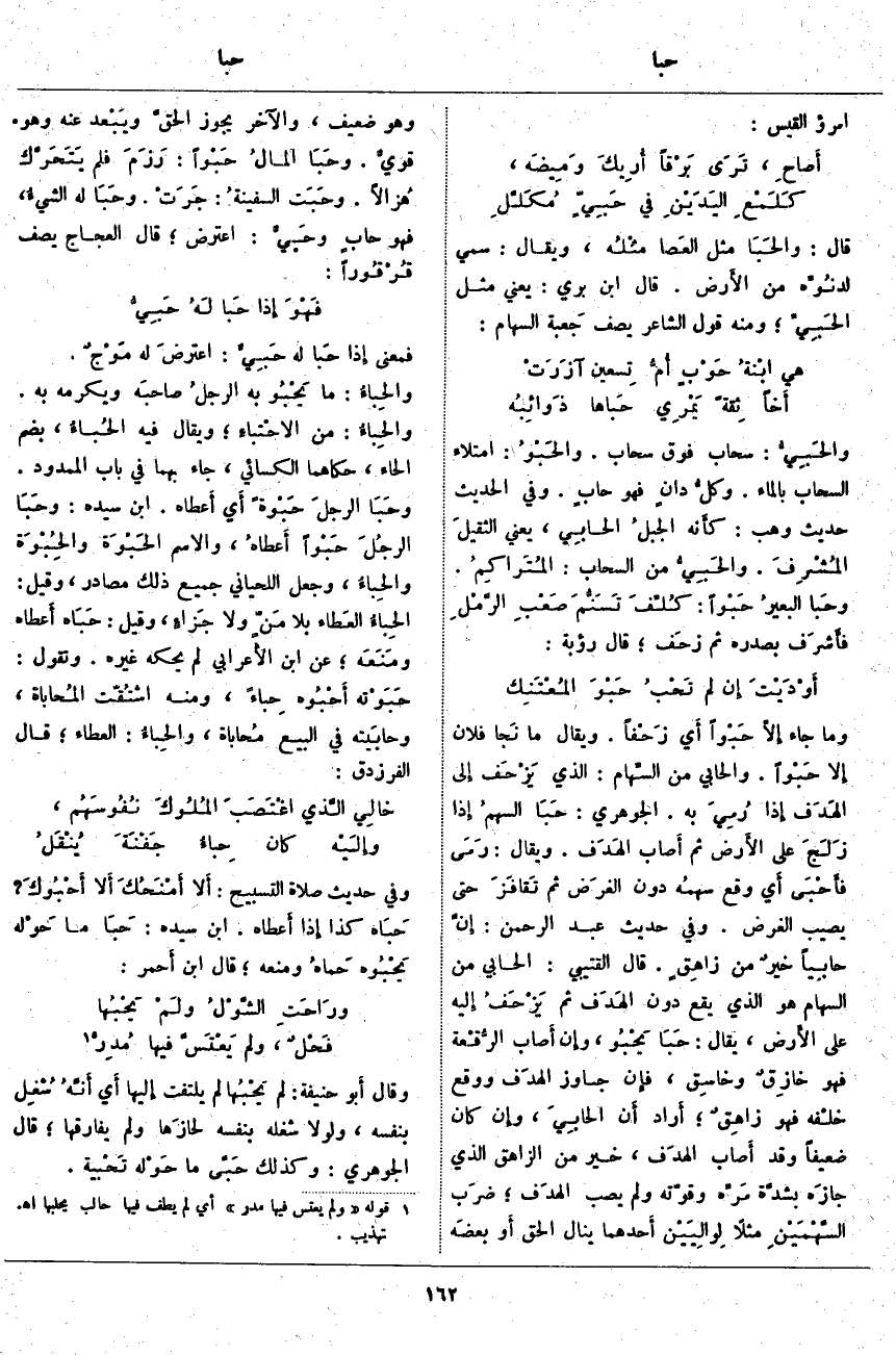 قَالَ الْقُتَيْبِيُّ: الحَابِي مِنَ السِّهَامِ هُوَ الَّذِي يَقَعُ دُونَ الهَدَف ثُمَّ يَزْحَفُ إِليه عَلَى الأَرض، يُقَالُ: حَبَا يَحْبُو، وإِن أَصاب الرُّقْعة فَهُوَ خازِقٌ وخاسِق، فإِن جَاوَزَ الهدَف وَوَقَعَ خلْفه فَهُوَ زاهِقٌ؛ أَراد أَن الحابِيَ، وإِن كَانَ ضَعِيفًا وَقَدْ أَصاب الهدَف، خَيْرٌ مِنَ الزَّاهِقِ الَّذِي جازَه بشدَّة مَرِّه وَقُوَّتِهِ وَلَمْ يُصِبِ الهدَف؛ ضرَب السَّهْمَيْنِ مَثَلًا لِوالِيَيْن أَحدهما يَنَالُ الْحَقَّ أَو بعضَه وَهُوَ ضَعِيفٌ، وَالْآخَرُ يَجُوزُ الحقَّ ويَبْعد، عَنْهُ وَهُوَ. قويٌّ. وحَبَا المالُ حَبْواً: رَزَمَ فَلَمْ يَتَحَرَّك هُزالًا. وحَبَت السفينةُ: جَرَتْ. وحَبَا لَهُ الشيءُ، فَهُوَ حَابٍ وحَبِيٌّ: اعْتَرَضَ؛ قَالَ الْعَجَّاجُ يَصِفُ قُرْقُوراً:
