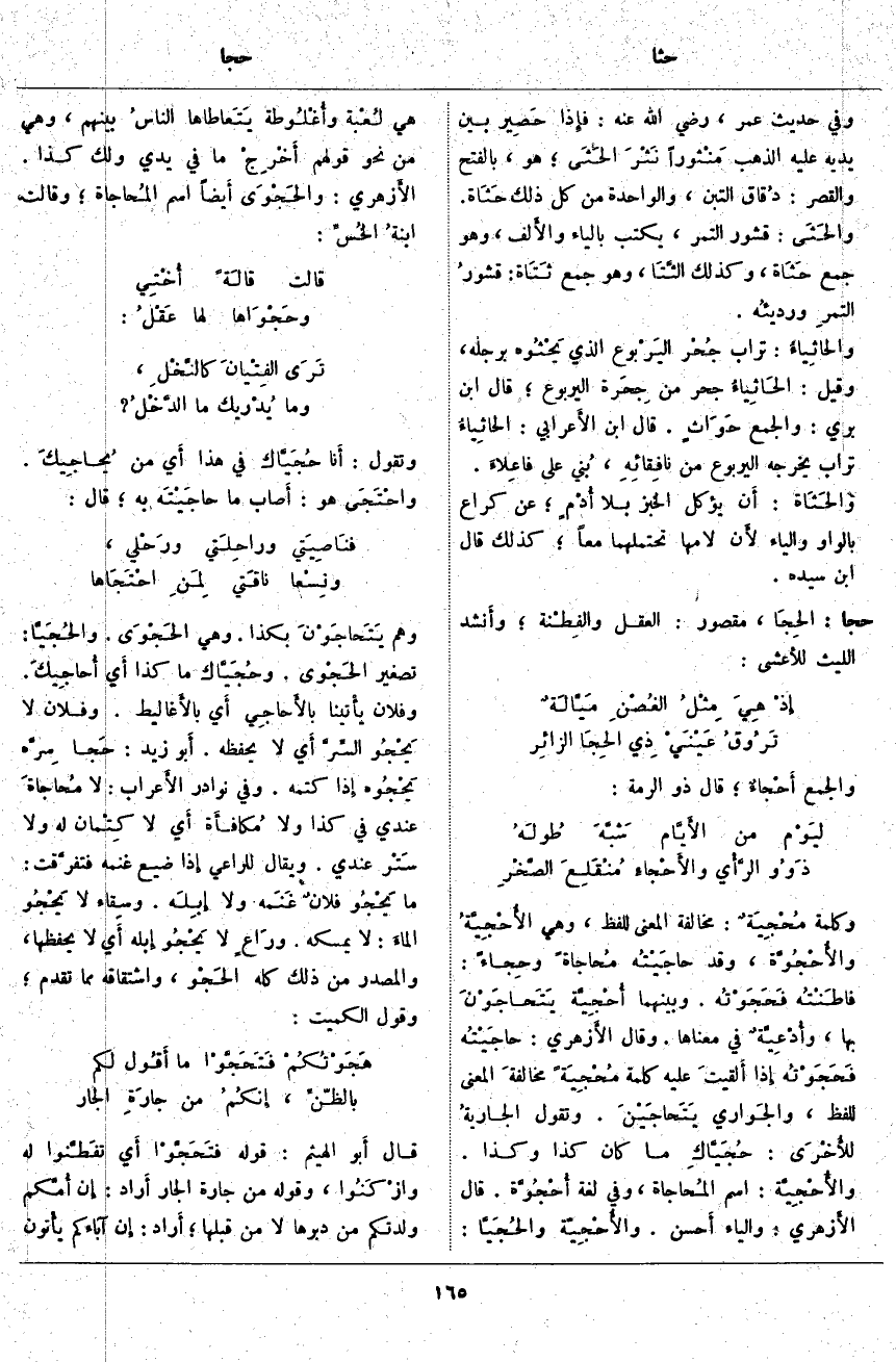 حجا: الحِجَا، مَقْصُورٌ: الْعَقْلُ والفِطْنة؛ وأَنشد اللَّيْثُ للأَعشى: