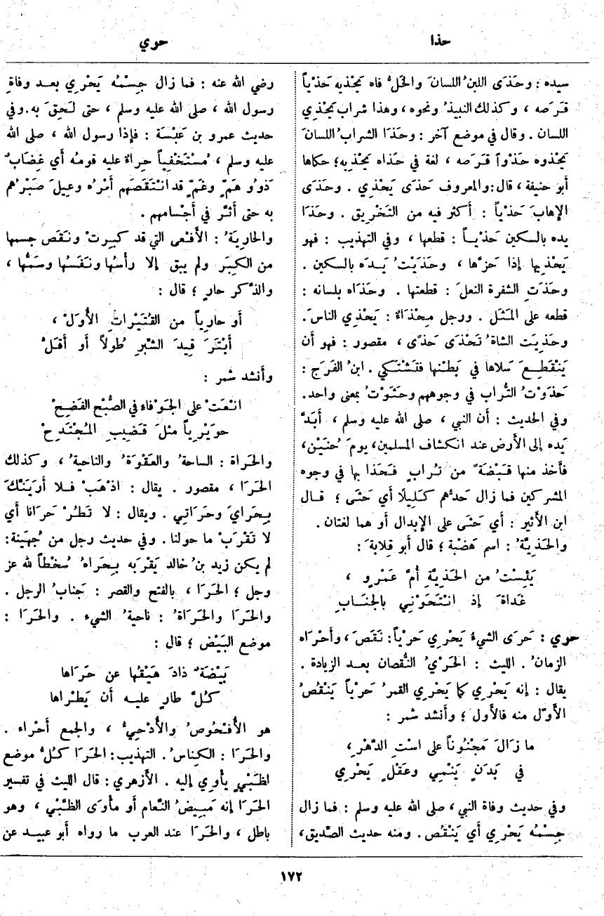 حري: حَرَى الشيءُ يَحْرِي حَرْياً: نَقَصَ، وأَحْرَاه الزمانُ. اللَّيْثُ: الحَرْيُ النُّقصان بَعْدَ الزِّيَادَةِ. يُقَالُ: إِنه يَحْرِي كَمَا يَحْرِي القمرُ حَرْياً يَنْقُصُ الأَوّل مِنْهُ فالأَول؛ وأَنشد شَمِرٌ: