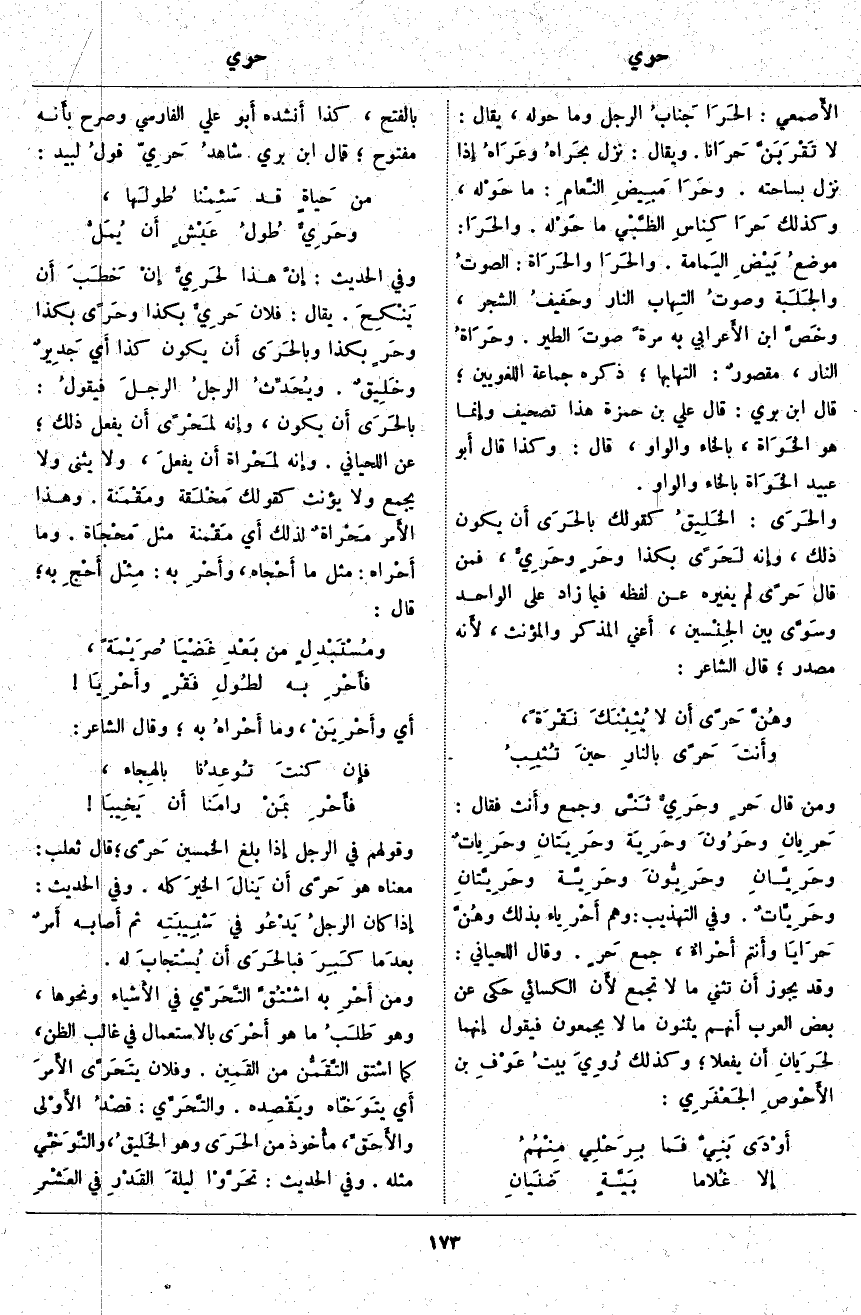 الأَصمعي: الحَرَا جَنابُ الرَّجُلِ وَمَا حَوْلَهُ، يُقَالُ: لَا تَقْرَبَنَّ حَرَانا. وَيُقَالُ: نَزَلَ بحَرَاهُ وعَرَاهُ إِذا نَزَلَ بِسَاحَتِهِ. وحَرَا مَبِيضِ النَّعامِ: ما حَوْله، وكذلك حَرَا كِناسِ الظَّبْي مَا حَوْله. والحَرَا: موضعُ بَيْضِ اليَمامة. والحَرَا والحَرَاة: الصوتُ والجَلَبة وصوتُ التِهاب النَّارِ وحَفيفُ الشَّجَرِ، وخَصَّ ابْنُ الأَعرابي بِهِ مَرَّةً صوتَ الطَّيْرِ. وحَرَاةُ النَّارِ، مقصورٌ: الْتِهَابُهَا؛ ذَكَرَهُ جَمَاعَةُ اللُّغَوِيِّينَ؛ قَالَ ابْنُ بَرِّيٍّ: قَالَ عَلِيُّ بْنُ حَمْزَةَ هَذَا تَصْحِيفٌ وإِنما هُوَ الخَوَاة، بِالْخَاءِ وَالْوَاوِ، قَالَ: وَكَذَا قَالَ أَبو عُبَيْدٍ الخَوَاة بِالْخَاءِ وَالْوَاوِ. والحَرَى: الخَلِيقُ كَقَوْلِكَ بالحَرَى أَن يَكُونَ ذَلِكَ، وإِنه لَحَرىً بِكَذَا وحَرٍ وحَرِيٌّ، فَمَنْ قَالَ حَرىً لَمْ يُغَيِّرْهُ عَنْ لَفْظِهِ فِيمَا زَادَ عَلَى الْوَاحِدِ وسَوَّى بَيْنَ الجِنْسين، أَعني الْمُذَكَّرَ وَالْمُؤَنَّثَ، لأَنه مَصْدَرٌ؛ قَالَ الشَّاعِرُ: