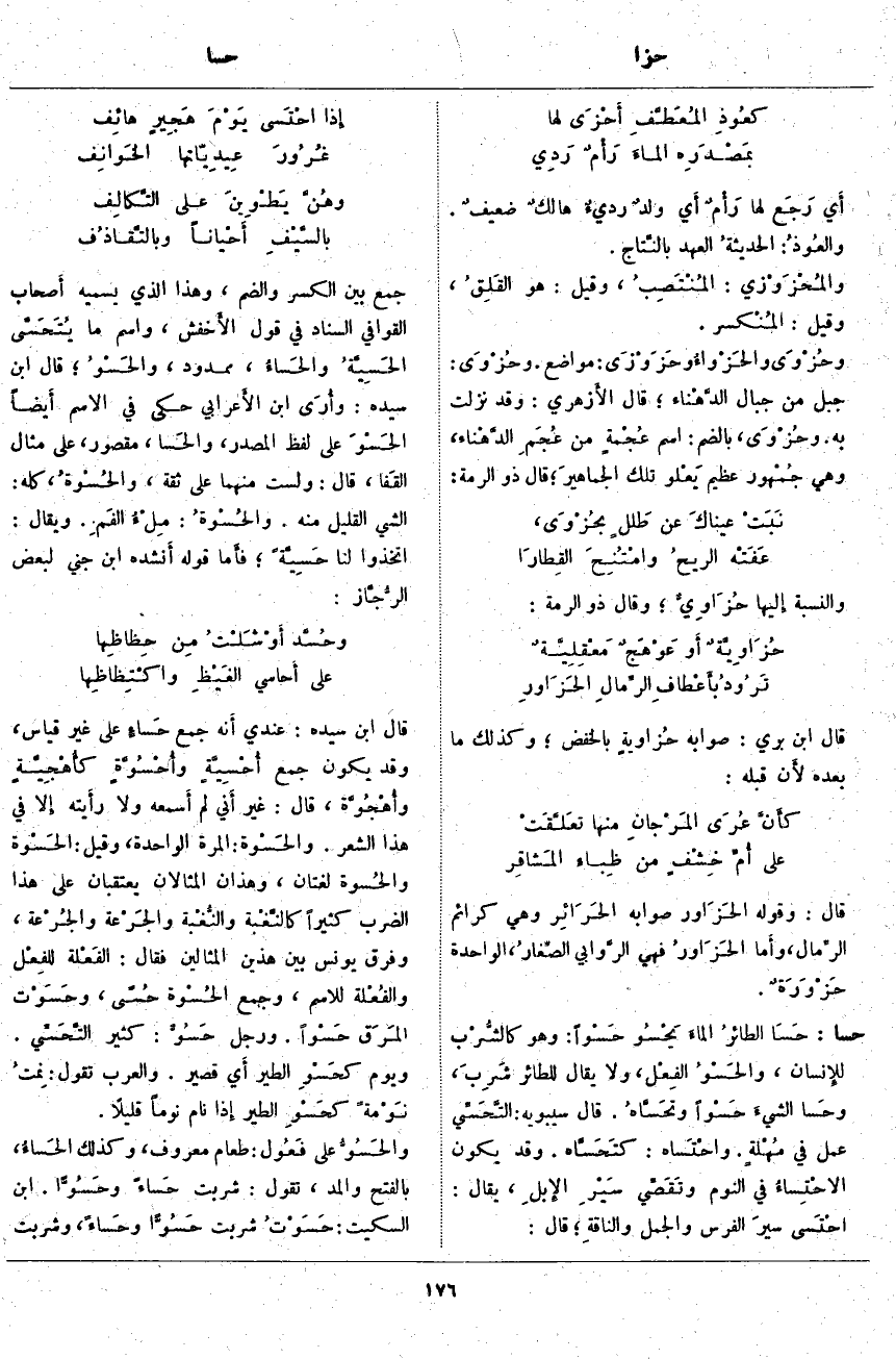 حسا: حَسَا الطائرُ الماءَ يَحْسُو حَسْواً: وَهُوَ كالشُّرْب للإِنسان، والحَسْوُ الفِعْل، وَلَا يُقَالُ لِلطَّائِرِ شَرِبَ، وحَسا الشيءَ حَسْواً وتحَسَّاهُ. قَالَ سِيبَوَيْهِ: التَّحَسِّي عَمَلٌ فِي مُهْلةٍ. واحْتَسَاه: كتَحَسَّاه. وَقَدْ يَكُونُ الاحْتِسَاءُ فِي النَّوْمِ وتَقَصِّي سَيْرِ الإِبلِ، يُقَالُ: احْتَسَى سيرَ الْفَرَسِ وَالْجَمَلِ والناقةِ؛ قَالَ: