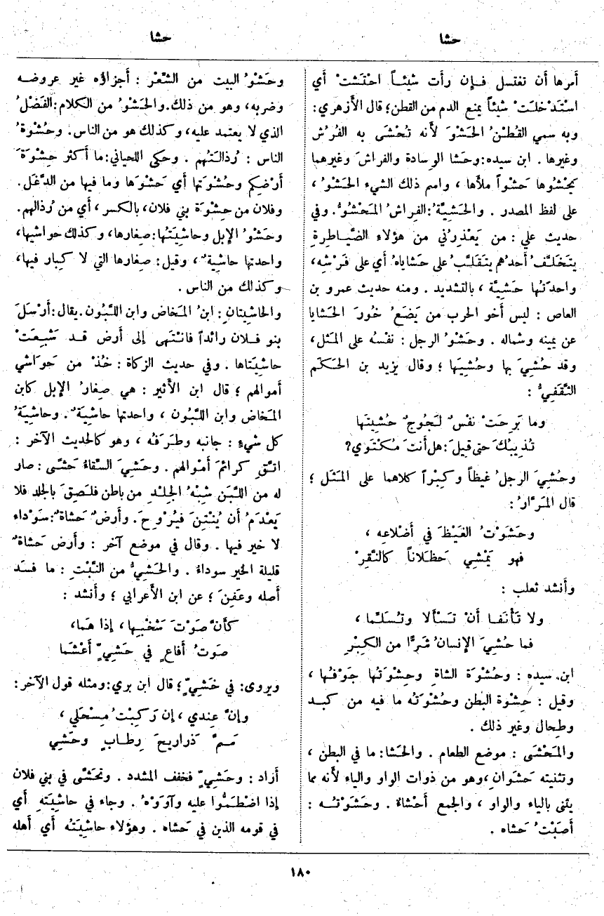 ابْنُ سِيدَهْ: وحُشْوَة الشاةِ وحِشْوَتُها جَوْفُها، وَقِيلَ: حِشْوة الْبَطْنِ وحُشْوَتُه مَا فِيهِ مِنْ كَبِدٍ وَطِحَالٍ وَغَيْرِ ذَلِكَ. والمَحْشَى: مَوْضِعُ الطَّعَامِ. والحَشَا: مَا فِي الْبَطْنِ، وَتَثْنِيَتُهُ حَشَوانِ، وَهُوَ مِنْ ذَوَاتِ الْوَاوِ وَالْيَاءِ لأَنه مِمَّا يُثَنَّى بِالْيَاءِ وَالْوَاوِ، وَالْجَمْعُ أَحْشَاءٌ. وحَشَوْتُه: أَصَبْتُ حَشاه. وحَشْوُ الْبَيْتِ مِنَ الشِّعْر: أَجزاؤُه غَيْرُ عَرُوضِهِ وَضَرْبِهِ، وَهُوَ مِنْ ذَلِكَ. والحَشْوُ مِنَ الْكَلَامِ: الفَضْلُ الَّذِي لَا يُعْتَمَدُ عَلَيْهِ، وَكَذَلِكَ هُوَ مِنَ النَّاسِ. وحُشْوَةُ النَّاسِ: رُذالَتُهم. وَحَكَى اللَّحْيَانِيُّ: مَا أَكثر حِشْوَةَ أَرْضِكم وحُشْوَتها أَي حَشْوَها وَمَا فِيهَا مِنَ الدَّغَل. وَفُلَانٌ مِنْ حِشْوَة بَنِي فُلَانٍ، بِالْكَسْرِ، أَي مِنْ رُذالهم. وحَشْوُ الإِبل وحَاشِيَتُها: صِغارها، وَكَذَلِكَ حَوَاشِيها، وَاحِدَتُهَا حَاشِيَةٌ، وَقِيلَ: صِغارها الَّتِي لَا كِبار فِيهَا، وَكَذَلِكَ مِنَ النَّاسِ. والحَاشِيَتانِ: ابنُ المَخاض وَابْنُ اللَّبُون. يُقَالُ: أَرْسَلَ بَنُو فُلَانٍ رَائِدًا فانْتَهى إِلى أَرض قَدْ شَبِعَتْ حاشِيَتاها. وَفِي حَدِيثِ الزَّكَاةِ: