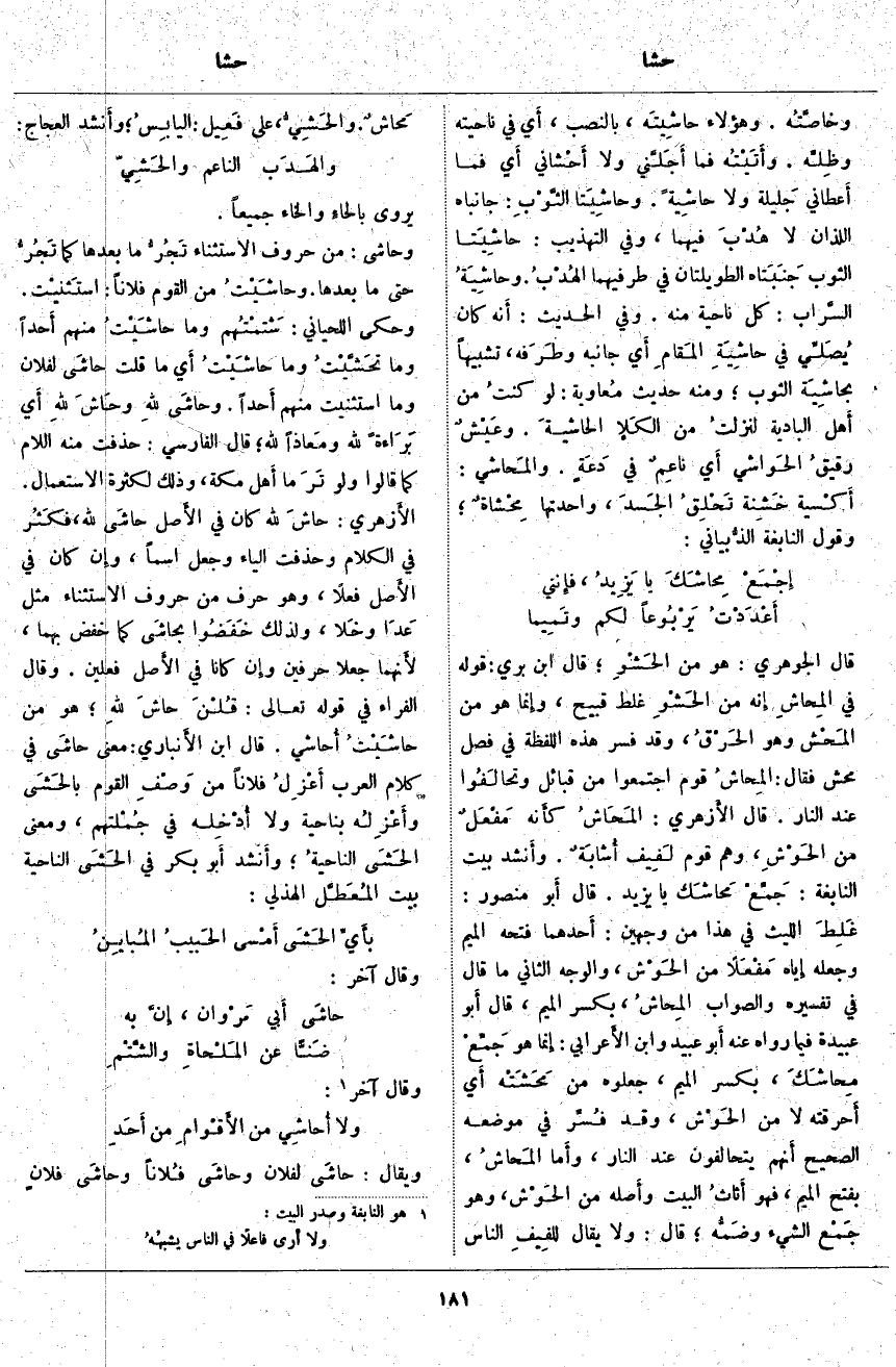 قَالَ الْجَوْهَرِيُّ: هُوَ مِنْ الحَشْوِ؛ قَالَ ابْنُ بَرِّيٍّ: قَوْلُهُ فِي المِحَاشِ إِنه مِنَ الحَشْوِ غَلَطٌ قَبِيحٌ، وإِنما هُوَ مِنَ المَحْش وَهُوَ الحَرْقُ، وَقَدْ فَسَّرَ هَذِهِ اللَّفْظَةَ فِي فَصْلِ مَحَشَ فَقَالَ: المِحاشُ قَوْمٌ اجْتَمَعُوا مِنْ قَبَائِلَ وتحالَفُوا عِنْدَ النَّارِ. قَالَ الأَزهري: المَحَاشُ كأَنه مَفْعَلٌ مِنَ الحَوْشِ، وَهُمْ قَوْمٌ لَفِيف أُشابَةٌ. وأَنشد بَيْتَ النَّابِغَةِ: جَمِّعْ مَحاشَك يَا يَزِيدُ. قَالَ أَبو مَنْصُورٍ: غَلِطَ اللَّيْثُ فِي هَذَا مِنْ وَجْهَيْنِ: أَحدهما فَتْحُهُ الْمِيمَ وَجَعْلُهُ إِياه مَفْعَلًا مِنَ الحَوْش، وَالْوَجْهُ الثَّانِي مَا قَالَ فِي تَفْسِيرِهِ وَالصَّوَابُ المِحاشُ، بِكَسْرِ الْمِيمِ، قَالَ أَبو عُبَيْدَةَ فِيمَا رَوَاهُ عَنْهُ أَبو عُبَيْدٍ وَابْنُ الأَعرابي: إِنما هُوَ جَمِّعْ مِحاشَكَ، بِكَسْرِ الْمِيمِ، جَعَلُوهُ من مَحَشَتْه أَي أَحرقته لَا مِنَ الحَوْش، وَقَدْ فُسِّر فِي مَوْضِعِهِ الصَّحِيحِ أَنهم يَتَحَالَفُونَ عِنْدَ النَّارِ، وأَما المَحاشُ، بِفَتْحِ الْمِيمِ، فَهُوَ أَثاثُ الْبَيْتِ وأَصله مِنَ الحَوْش، وَهُوَ جَمْع الشَّيْءِ وضَمُّه؛ قَالَ: وَلَا يُقَالُ للفِيفِ النَّاسِ مَحاشٌ. والحَشِيُّ، عَلَى فَعِيل: اليابِسُ؛ وأَنشد الْعَجَّاجُ: