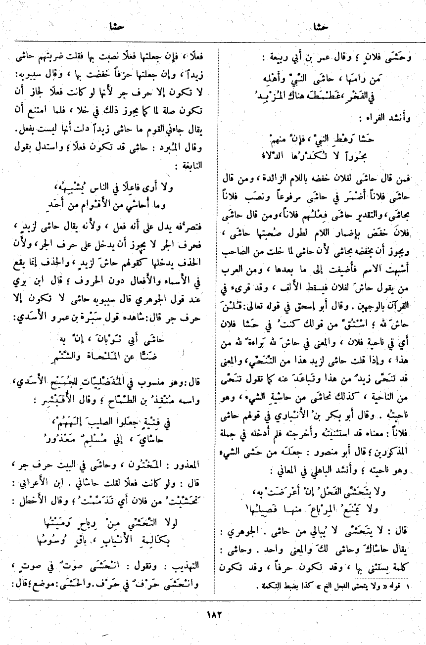 الْمَعْذُورُ: المَخْتُون، وحَاشَى فِي الْبَيْتِ حَرْفُ جَرٍّ، قَالَ: وَلَوْ كَانَتْ فِعْلًا لَقُلْتَ حَاشَانِي. ابْنُ الأَعرابي: تَحَشَّيْتُ مِنْ فلان أَي تَذَمَّمْتُ؛ وَقَالَ الأَخطل: