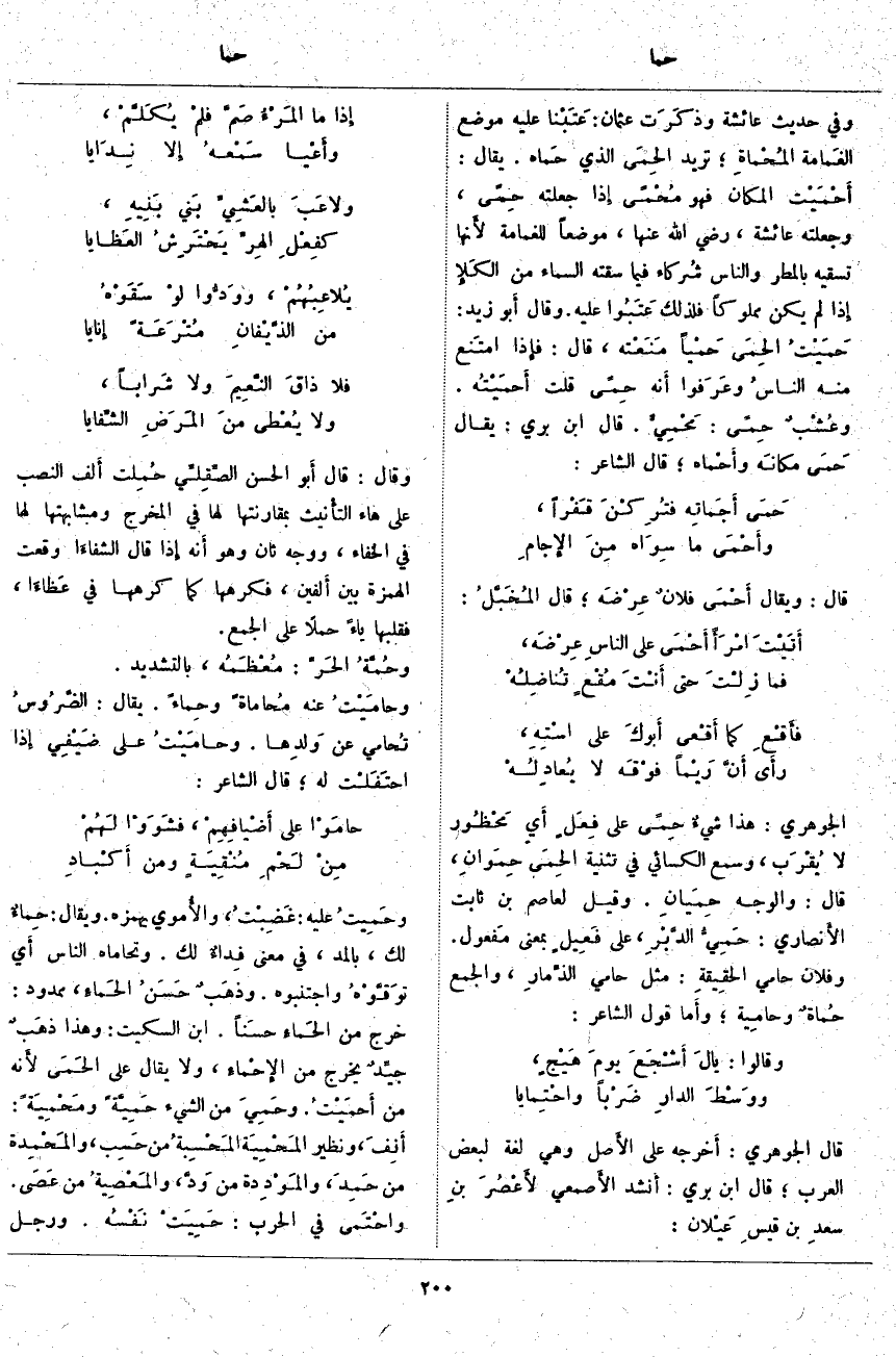 وَقَالَ: قَالَ أَبو الْحَسَنِ الصِّقِلِّي حُمِلت أَلف النَّصْبِ عَلَى هَاءِ التأْنيث بِمُقَارَنَتِهَا لَهَا فِي الْمَخْرَجِ وَمُشَابَهَتِهَا لَهَا فِي الْخَفَاءِ، وَوَجْهٌ ثَانٍ وَهُوَ أَنه إِذَا قَالَ الشفاءَا وَقَعَتِ الْهَمْزَةُ بَيْنَ أَلفين، فَكَرِهَهَا كَمَا كَرِهَهَا فِي عَظاءَا، فَقَلَبَهَا يَاءً حَمْلًا عَلَى الْجَمْعِ. وحُمَّةُ الحَرِّ: مُعْظَمُه، بِالتَّشْدِيدِ. وحامَيْتُ عَنْهُ مُحاماةً وحِماءً. يُقَالُ: الضَّرُوسُ تُحامِي عَنْ وَلدِها. وحامَيْتُ عَلَى ضَيْفِي إِذَا احتَفَلْت لَهُ؛ قَالَ الشَّاعِرُ: