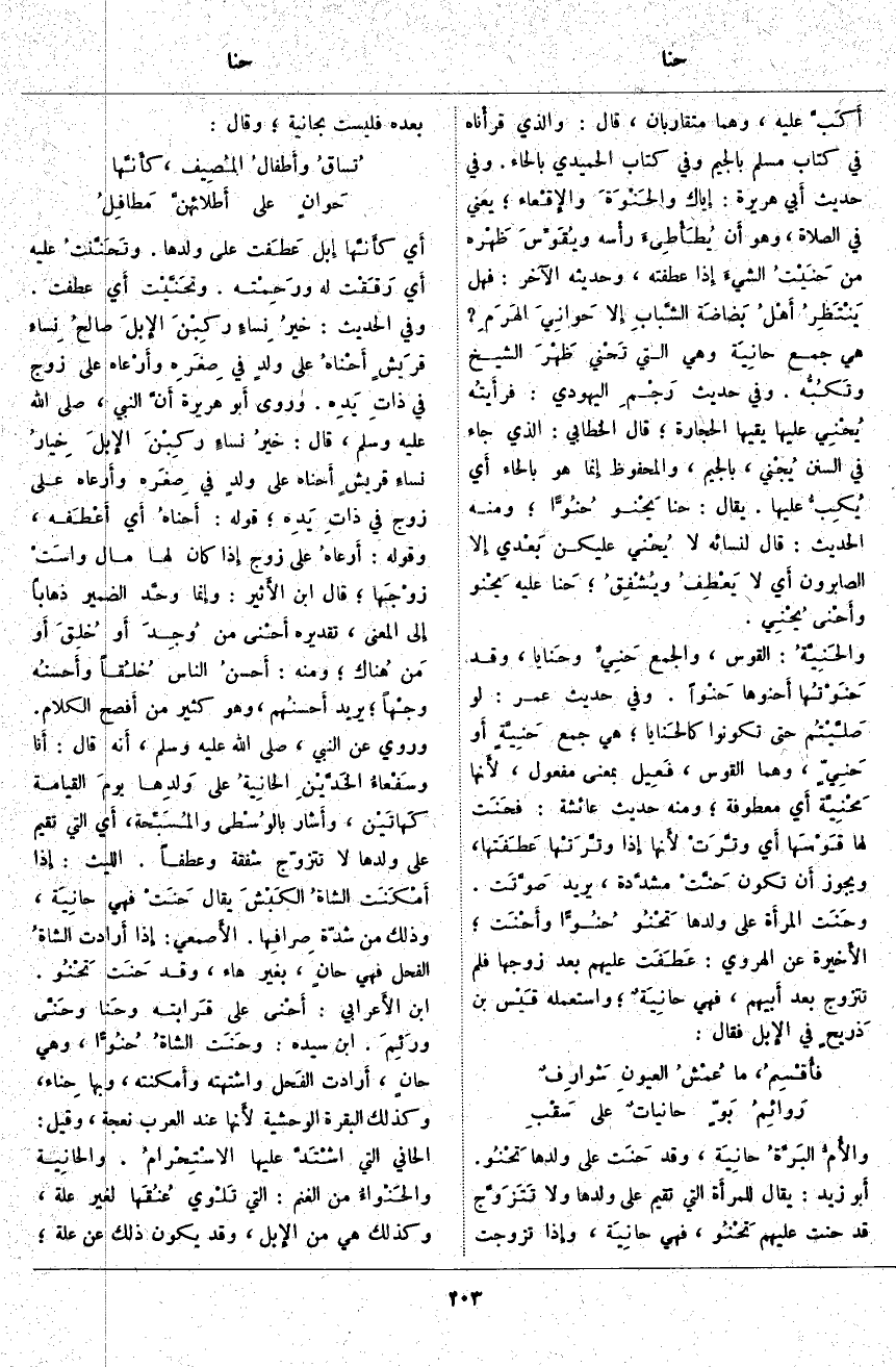 ، أَي الَّتِي تُقِيمُ عَلَى وَلَدِهَا لَا تَتَزَوَّجُ شَفَقَةً وَعَطْفًا. اللَّيْثُ: إِذا أَمْكَنَت الشاةُ الكَبْشَ يُقَالُ حَنَتْ فَهِيَ حانِيَة، وَذَلِكَ مِنْ شِدَّةِ صِرافِها. الأَصمعي: إِذا أَرادت الشاةُ الْفَحْلَ فَهِيَ حانٍ، بِغَيْرِ هَاءٍ، وَقَدْ حَنَت تَحْنُو. ابْنُ الأَعرابي: أَحْنَى عَلَى قَرابته وحَنَا وحَنَّى ورَئِمَ. ابْنُ سِيدَهْ: وحَنَت الشاةُ حُنُوّاً، وَهِيَ حانٍ، أَرادت الفَحل وَاشْتَهَتْهُ وأَمكنته، وَبِهَا حِناء، وَكَذَلِكَ الْبَقَرَةُ الْوَحْشِيَّةُ لأَنها عِنْدَ الْعَرَبِ نَعْجَةٌ، وَقِيلَ: الْحَانِي الَّتِي اشْتَدَّ عَلَيْهَا الاسْتِحْرامُ. والحانِية والحَنْواءُ مِنَ الْغَنَمِ: الَّتِي تَلْوي عُنُقَها لِغَيْرِ عِلَّةٍ، وَكَذَلِكَ هِيَ مِنَ الإِبل، وَقَدْ يَكُونُ ذَلِكَ عَنْ عِلَّةٍ؛