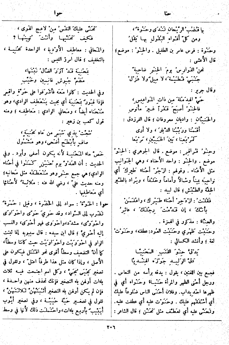 حوا: الحُوَّةُ: سَوَادٌ إِلى الخُضْرة، وَقِيلَ: حُمْرةٌ تَضْرب إِلى السَّواد، وَقَدْ حَوِيَ حَوىً واحْوَاوَى واحْوَوَّى، مُشَدَّدٌ، واحْوَوى فَهُوَ أَحْوَى، وَالنَّسَبُ إِليه أَحْوِيٌّ؛ قَالَ ابْنُ سِيدَهْ: قَالَ سِيبَوَيْهِ إِنما ثَبَتَتِ الْوَاوُ فِي احْوَوَيْت واحْوَاوَيْت حَيْثُ كَانَتَا وَسَطًا، كَمَا أَنَّ التَّضْعِيفَ وَسَطًا أَقوى نَحْوُ اقْتَتل فَيَكُونُ عَلَى الأَصل، وإِذا كَانَ مِثْلُ هَذَا طَرَفًا اعْتَلَّ، وَتَقُولُ فِي تَصْغِيرِ يَحْيَى يُحَيٌّ، وَكُلُّ اسْمٍ اجْتَمَعَتْ فِيهِ ثَلَاثُ ياءَات أَولهن يَاءُ التَّصْغِيرِ فإِنك تَحْذِفُ مِنْهُنَّ وَاحِدَةً، فإِن لَمْ يَكُنْ أَولهن يَاءَ التَّصْغِيرِ أَثْبَتَّهُنَّ ثَلاثَتَهُنَّ، تَقُولُ فِي تَصْغِيرِ حَيَّة حُيَيَّة، وَفِي تَصْغِيرِ أَيُّوب أُيَيِّيبٌ بأَربع ياءَات، واحْتَملَت ذَلِكَ لأَنها فِي وَسَطِ