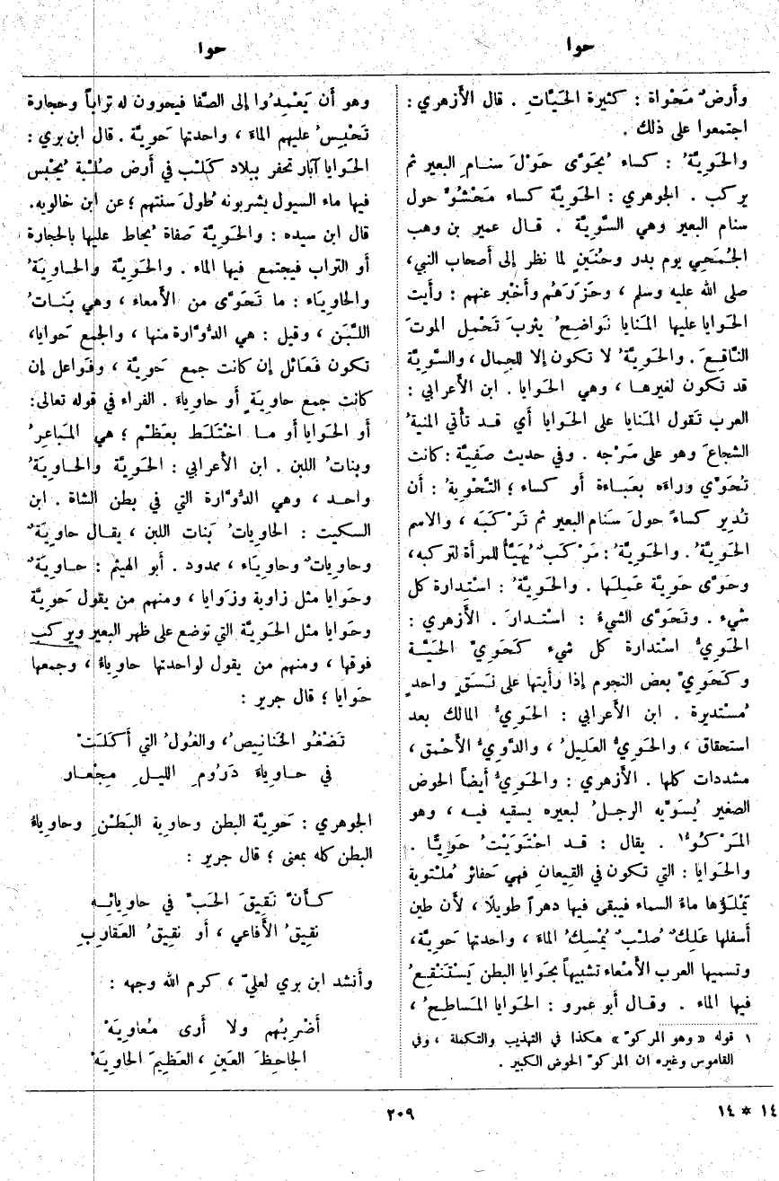؛ التَّحْوِيةُ: أَن تُدير كِسَاءً حولَ سَنام الْبَعِيرِ ثُمَّ تَرْكَبَه، وَالِاسْمُ الحَوِيّةُ. والحَوِيّةُ: مَرْكَبٌ يُهَيّأ للمرأَة لِتَرْكَبَهُ، وحَوَّى حَوِيَّة عَمِلَها. والحَوِيَّةُ: اسْتدارة كُلِّ شَيْءٍ. وتَحَوَّى الشيءُ: استدارَ. الأَزهري: الحَوِيُّ اسْتِدَارَةُ كُلِّ شَيْءٍ كَحَوِيِّ الحَيَّة وكَحَوِيِّ بَعْضِ النُّجُومِ إِذَا رأَيتها عَلَى نَسَقٍ واحدٍ مُستديرة. ابْنُ الأَعرابي: الحَوِيُّ الْمَالِكُ بَعْدَ اسْتِحْقَاقٍ، والحَوِيُّ العَلِيلُ، والدَّوِيُّ الأَحمق، مُشَدَّدَاتٌ كُلُّهَا. الأَزهري: والحَوِيُّ أَيضاً الْحَوْضُ الصَّغِيرُ يُسَوِّيه الرجلُ لِبَعِيرِهِ يَسْقِيهِ فِيهِ، وَهُوَ المَرْكُوُّ «4». يُقَالُ: قَدِ احتَوَيْتُ حَوِيّاً. والحَوَايا: الَّتِي تَكُونُ فِي القِيعانِ فَهِيَ حَفَائِرُ مُلْتوية يَمْلَؤها ماءُ السَّمَاءِ فَيَبْقَى فِيهَا دَهْرًا طَوِيلًا، لأَن طِينَ أَسفلها عَلِكٌ صُلْبٌ يُمْسِكُ الماءَ، وَاحِدَتُهَا حَوِيَّة، وَتُسَمِّيهَا الْعَرَبُ الأَمْعاء تَشْبِيهًا بحَوايا الْبَطْنِ يَسْتَنْقِعُ فِيهَا الْمَاءُ. وَقَالَ أَبو عَمْرٍو: الحَوايا المَساطِحُ، وَهُوَ أَن يَعْمِدوا إِلَى الصَّفا فَيَحْوُونَ لَهُ تُرَابًا وَحِجَارَةً تَحْبِسُ عَلَيْهِمُ الماءَ، وَاحِدَتُهَا حَوِيَّة. قَالَ ابْنُ بَرِّيٍّ: الحَوَايا آبَارٌ تُحْفَرُ بِبِلَادِ كَلْب فِي أَرض صُلْبة يُحْبس فِيهَا مَاءُ السُّيُولِ يَشْرَبُونَهُ طُولَ سَنَتِهِمْ؛ عَنِ ابْنِ خَالَوَيْهِ. قَالَ ابْنُ سِيدَهْ: والحَوِيَّة صَفَاةٌ يُحاط عَلَيْهَا بِالْحِجَارَةِ أَو التُّرَابِ فَيَجْتَمِعُ فِيهَا الْمَاءُ. والحَوِيَّة والحاوِيَةُ والحاوِيَاء: مَا تَحَوَّى مِنَ الأَمعاء، وَهِيَ بَناتُ اللَّبَن، وَقِيلَ: هِيَ الدُّوَّارة مِنْهَا، وَالْجَمْعُ حَوَايا، تَكُونُ فَعَائل إِنْ كَانَتْ جَمْعَ حَوِيَّة، وفَواعل إِنْ كَانَتْ جَمْعَ حاوِيَةٍ أَو حاوِياءَ. الْفَرَّاءُ فِي قَوْلِهِ تَعَالَى: أَوِ الْحَوايا أَوْ مَا اخْتَلَطَ بِعَظْمٍ