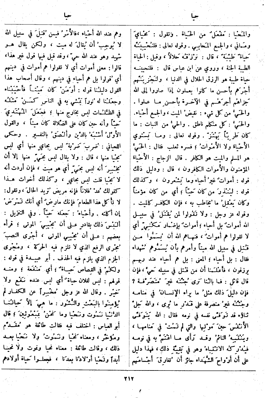 والحَيُّ مِنْ كُلِّ شَيْءٍ: نقيضُ الْمَيِّتِ، وَالْجَمْعُ أَحْيَاء. والحَيُّ: كُلُّ مُتَكَلِّمٍ نَاطِقٍ. والحيُّ مِنَ النَّبَاتِ: مَا كَانَ طَرِيّاً يَهْتَزّ. وَقَوْلُهُ تَعَالَى: وَما يَسْتَوِي الْأَحْياءُ وَلَا الْأَمْواتُ