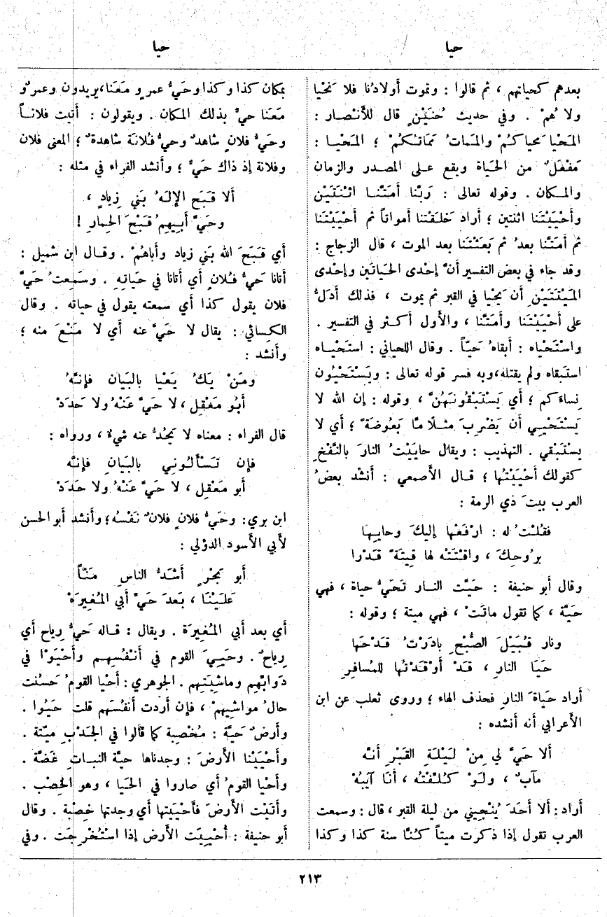 أَي بَعْدَ أَبي المُغيرَة. وَيُقَالُ: قَالَهُ حَيُّ رِياح أَي رِياحٌ. وحَيِيَ الْقَوْمُ فِي أَنْفُسِهم وأَحْيَوْا فِي دَوابِّهِم وماشِيَتِهم. الْجَوْهَرِيُّ: أَحْيَا القومُ حَسُنت حالُ مواشِيهمْ، فَإِنْ أَردت أَنفُسَهم قُلْتَ حَيُوا. وأَرضٌ حَيَّة: مُخْصِبة كَمَا قَالُوا فِي الجَدْبِ مَيِّتَةٌ. وأَحْيَيْنا الأَرضَ: وَجَدْنَاهَا حيَّة النباتِ غَضَّة. وأَحْيَا القومُ أَي صَارُوا فِي الحَيا، وَهُوَ الخِصْب. وأَتَيْت الأَرضَ ف أَحْيَيتها أَي وَجَدْتُهَا خِصْبة. وَقَالَ أَبو حَنِيفَةَ: أُحْيِيَت الأَرض إِذَا اسْتُخْرِجَت. وَفِي