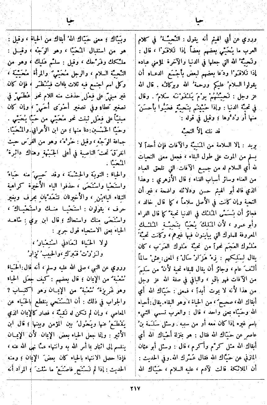 وَرُوِيَ عَنْ أَبي الْهَيْثَمِ أَنه يَقُولُ: التَّحِيَّةُ فِي كَلَامِ الْعَرَبِ مَا يُحَيِّي بَعْضُهُمْ بَعْضًا إِذَا تَلاقَوْا، قَالَ: وتَحِيَّةُ اللَّهِ الَّتِي جَعَلَهَا فِي الدُّنْيَا وَالْآخِرَةِ لِمُؤْمِنِي عِبَادِهِ إِذَا تَلاقَوْا ودَعا بَعْضُهُمْ لِبَعْضٍ بأَجْمَع الدُّعَاءِ أَن يَقُولُوا السلامُ عَلَيْكُمْ ورحمةُ اللَّهِ وبركاتُه. قَالَ اللَّهُ عَزَّ وَجَلَّ: تَحِيَّتُهُمْ يَوْمَ يَلْقَوْنَهُ سَلامٌ