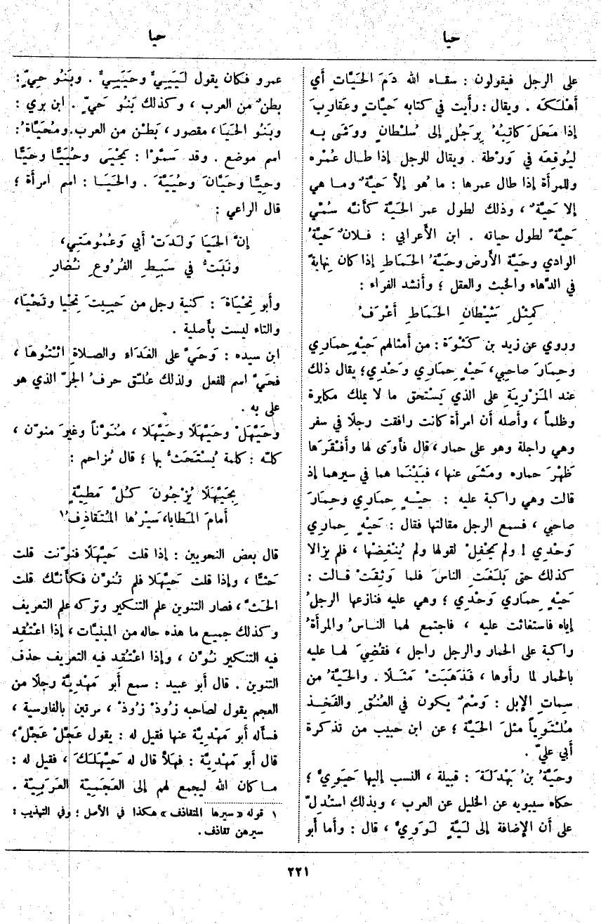 حَيْهٍ حِمَاري وَحْدِي؛ وَهِيَ عَلَيْهِ فَنَازَعَهَا الرجلُ إِيَّاهُ فَاسْتَغَاثَتْ عَلَيْهِ، فَاجْتَمَعَ لَهُمَا الناسُ والمرأَةُ رَاكِبَةٌ عَلَى الْحِمَارِ وَالرَّجُلُ رَاجِلٌ، فقُضِيَ لَهَا عَلَيْهِ بِالْحِمَارِ لَمَّا رأَوها، فَذَهَبَتْ مَثَلًا. والحَيَّةُ مِنْ سِماتِ الإِبل: وَسْمٌ يَكُونُ فِي العُنُقِ والفَخِذ مُلْتَوِياً مثلَ الحَيَّة؛ عَنِ ابْنِ حَبِيبٍ مِنْ تَذْكِرَةِ أَبِي عَلِيٍّ. وحَيَّةُ بنُ بَهْدَلَةَ: قَبِيلَةٌ، النَّسَبُ إِلَيْهَا حَيَوِيٌّ؛ حَكَاهُ سِيبَوَيْهِ عَنِ الْخَلِيلِ عَنِ الْعَرَبِ، وَبِذَلِكَ استُدِلّ عَلَى أَن الإِضافة إِلَى لَيَّةٍ لَوَوِيٌّ، قَالَ: وأَما أَبو عَمْرٍو فَكَانَ يَقُولُ لَيَيِيٌّ وحَيَيِيٌّ. وبَنُو حِيٍّ: بطنٌ مِنَ الْعَرَبِ، وَكَذَلِكَ بَنُو حَيٍّ. ابْنُ بَرِّيٍّ: وبَنُو الحَيَا، مَقْصُورٌ، بَطْن مِنَ الْعَرَبِ. ومُحَيَّاةُ: اسْمُ مَوْضِعٍ. وَقَدْ سَمَّوْا: يَحْيَى وحُيَيّاً وحَيّاً وحِيّاً وحَيَّانَ وحُيَيَّةَ. والحَيَا: اسْمُ امرأَة؛ قَالَ الرَّاعِي: