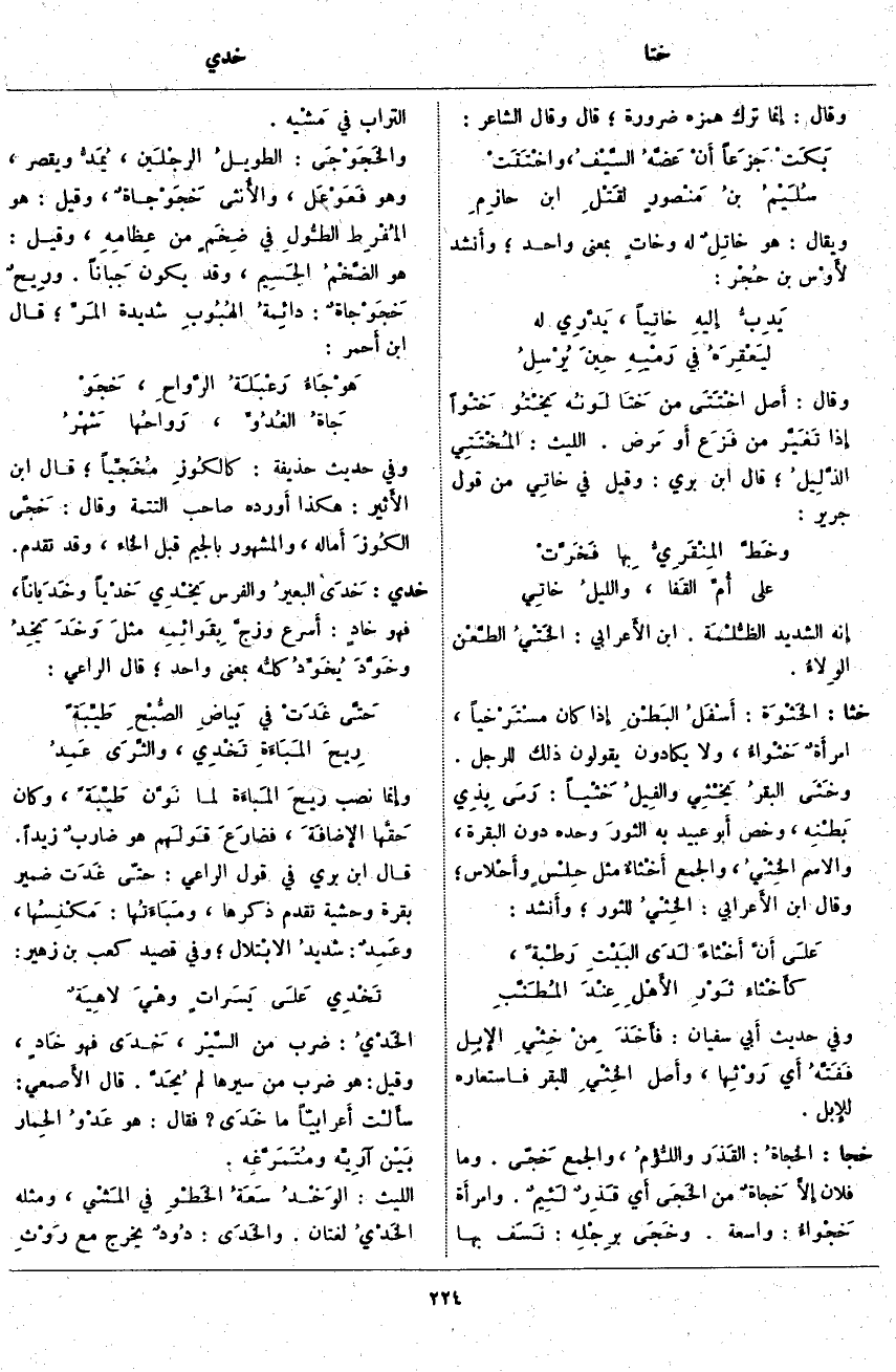 خجا: الخجاةُ: القَذَر واللُّؤْمُ، وَالْجَمْعُ خَجًى. وَمَا فُلَانٌ إِلَّا خَجاةٌ مِنَ الخَجَى أَي قَذِرٌ لَئِيمٌ. وامرأَة خَجْواءُ: وَاسِعَةٌ. وخَجَى برِجْلِه: نَسَف بِهَا التُّرَابَ فِي مَشْيه. والخَجَوْجَى: الطويلُ الرجْلَين، يُمَدُّ وَيُقْصَرُ، وَهُوَ فَعَوْعَل، والأُنثى خَجَوْجَاةٌ، وَقِيلَ: هُوَ المُفْرِط الطُّولِ فِي ضِخَمٍ مِنْ عِظامِهِ، وَقِيلَ: هُوَ الضَّخْمُ الجَسِيم، وَقَدْ يَكُونُ جَباناً. ورِيحٌ خَجَوْجاةٌ: دائِمةُ الهُبُوبِ شَدِيدَةُ المَرِّ؛ قَالَ ابْنُ أَحمر: