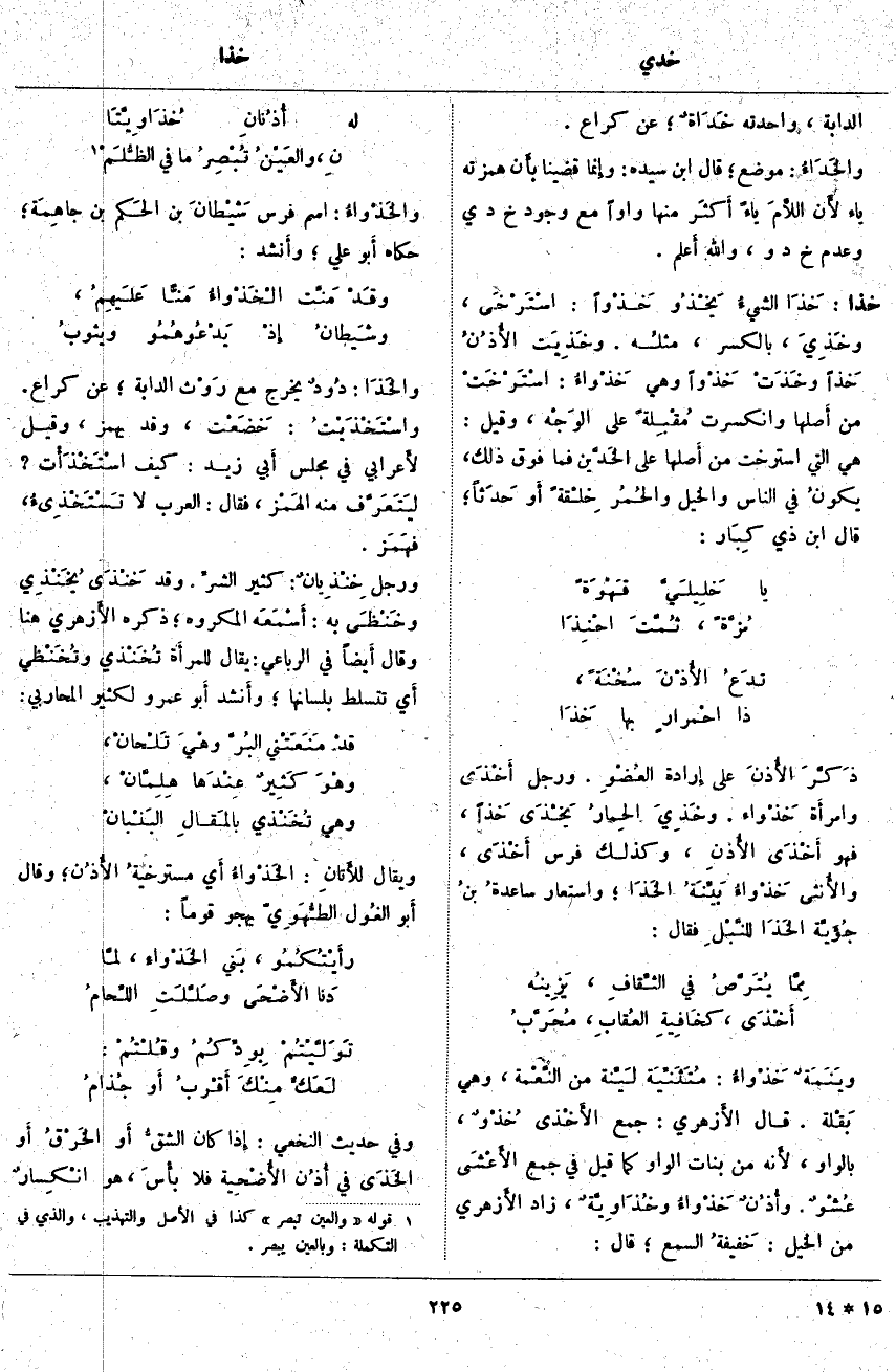 لَهُ أُذُنانِ خُذَاوِيَّتَانِ، ... والعَيْنُ تُبْصِرُ مَا فِي الظُّلَمْ «2»