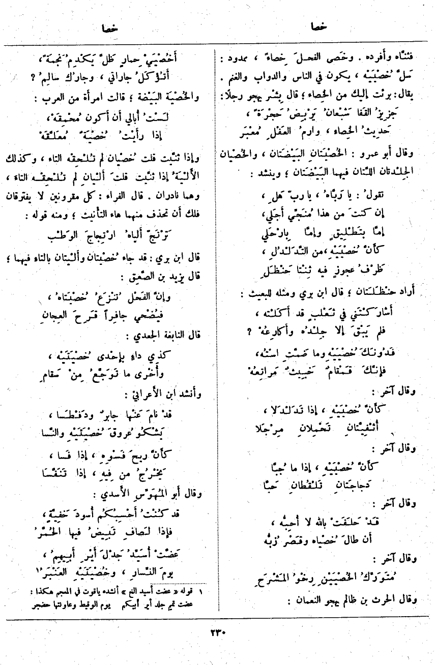 وإِذا ثنَّيت قُلْتَ خُصْيان لَمْ تُلْحِقْه التَّاءَ، وَكَذَلِكَ الأَلْيَةُ إِذا ثنَّيت قلتَ أَلْيانِ لَمْ تُلْحِقْه التاءَ، وَهُمَا نَادِرَانِ. قَالَ الْفَرَّاءُ: كُلُّ مَقْرُونَيْنِ لَا يَفْتَرِقَانِ فَلَكَ أَن تَحْذِفَ مِنْهُمَا هَاءَ التأْنيث؛ وَمِنْهُ قَوْلُهُ: