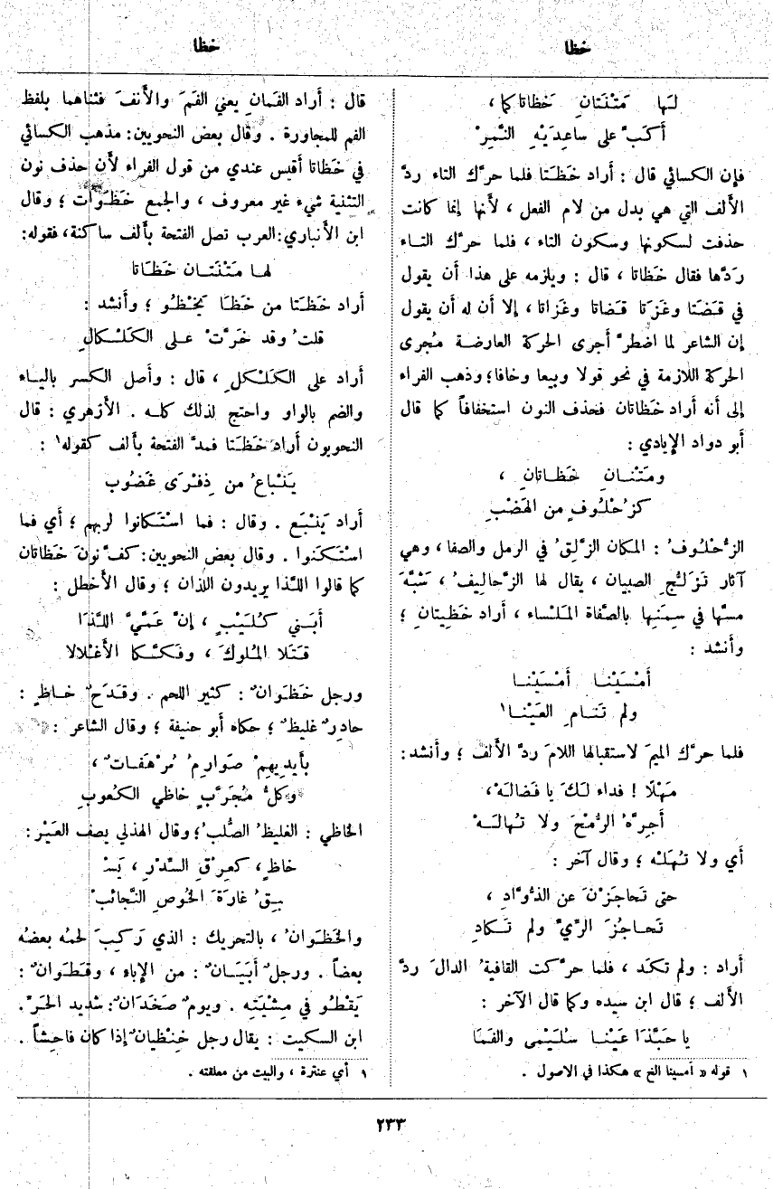 قَالَ: أَراد الفَمانِ يَعْنِي الفَمَ والأَنفَ فَثَنَّاهُمَا بِلَفْظِ الْفَمِ لِلْمُجَاوِرَةِ. وَقَالَ بَعْضُ النَّحْوِيِّينَ: مَذْهَبُ الْكِسَائِيِّ فِي خَظاتا أَقيس عِنْدِي مِنْ قَوْلِ الْفَرَّاءِ لأَن حَذْفَ نُونِ التَّثْنِيَةِ شَيْءٌ غَيْرُ مَعْرُوفٍ، وَالْجَمْعُ خَظَوات؛ وَقَالَ ابْنُ الأَنباري: الْعَرَبُ تَصِلُ الْفَتْحَةَ بأَلف سَاكِنَةٍ، فَقَوْلُهُ: