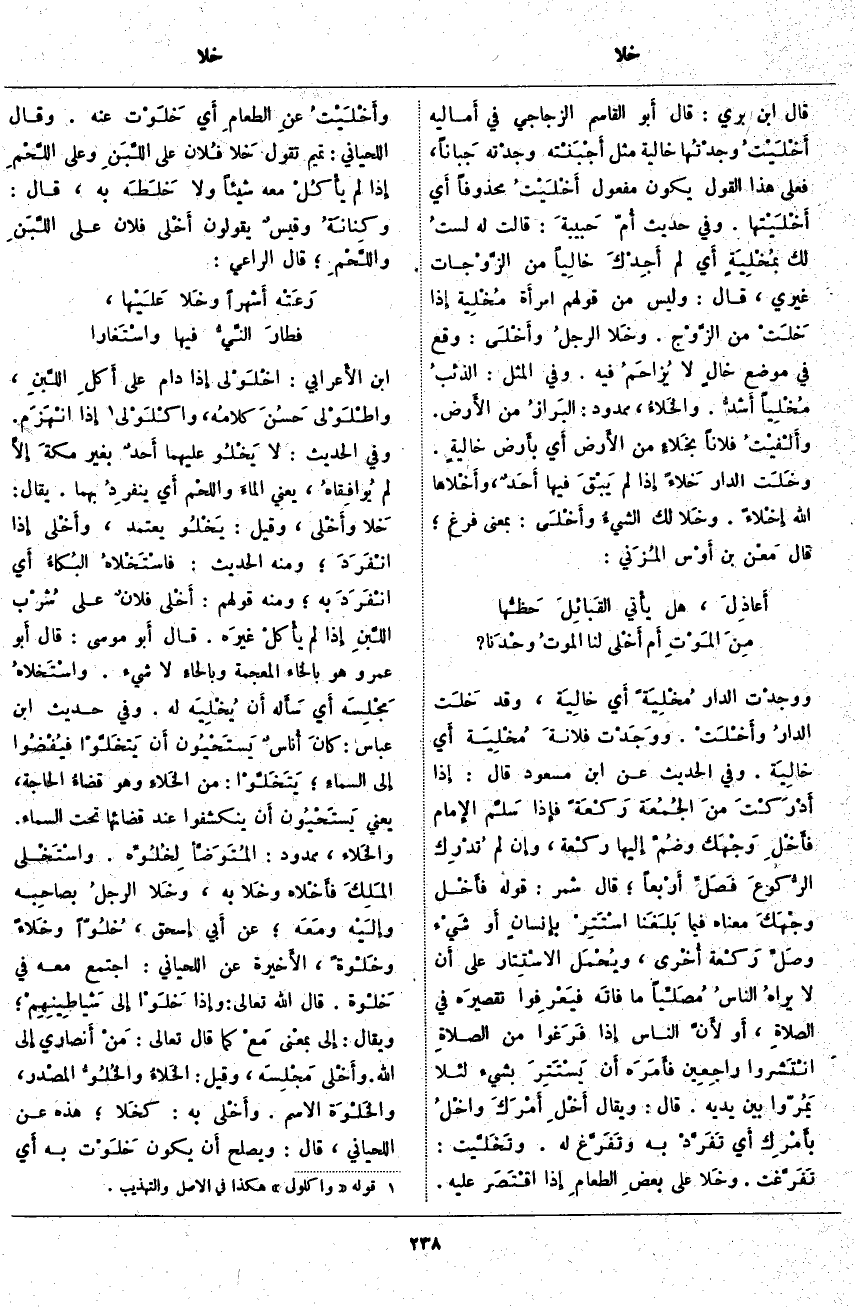 ؛ قَالَ شَمِرٌ: قوله ف أَخْلِ وجْهَكَ مَعْنَاهُ فِيمَا بَلَغَنا اسْتَتِرْ بإِنسانٍ أَو شَيءْ وصَلِّ رَكْعة أُخْرى، ويُحْمَل الاسْتِتار عَلَى أَن لَا يراهُ الناسُ مُصَلِّياً مَا فاتَه فَيَعْرِفوا تقصيرَه فِي الصلاةِ، أَو لأَنَّ النَّاسَ إِذا فَرَغوا مِنَ الصلاةِ انْتَشروا راجِعِين فأَمَرَه أَن يَسْتَتِرَ بِشَيْءٍ لِئَلَّا يَمُرّوا بَيْنَ يَدَيْهِ. قَالَ: وَيُقَالُ أَخْلِ أَمْرَكَ واخْلُ بأَمْرِك أَي تَفَرَّدْ بِهِ وتَفَرَّغ لَهُ. وتَخَلَّيت: تَفَرَّغت. وخَلا عَلَى بعضِ الطعامِ إِذا اقْتَصَر عَلَيْهِ. وأَخْلَيْتُ عنِ الطعامِ أَي خَلَوْت عَنْهُ. وَقَالَ اللِّحْيَانِيُّ: تَمِيمٌ تَقُولُ خَلا فُلان عَلَى اللَّبَنِ وَعَلَى اللَّحْمِ إِذا لَمْ يأْكُلْ مَعَهُ شَيْئًا وَلَا خَلَطَه بِهِ، قَالَ: وكِنانَةُ وقيسٌ يَقُولُونَ أَخْلى فُلَانٌ عَلَى اللَّبَنِ واللَّحْمِ؛ قَالَ الرَّاعِي: