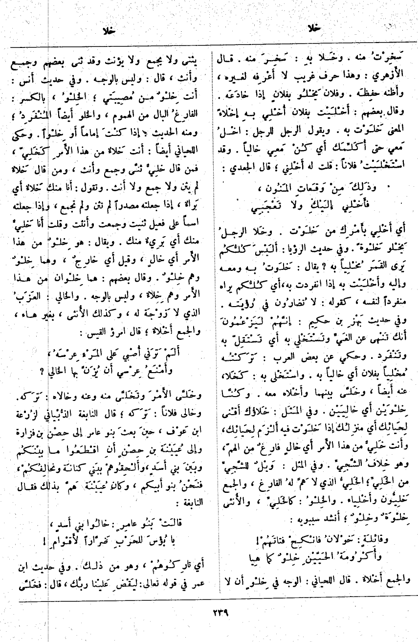 وَحَكَى اللِّحْيَانِيُّ أَيضاً: أَنت خَلاءٌ مِنْ هَذَا الأَمرِ كَخَلِيّ، فَمَنْ قَالَ خِليٌّ ثنَّى وَجَمَعَ وأَنث، وَمَنْ قَالَ خَلاءٌ لَمْ يُثَنِّ وَلَا جَمَعَ وَلَا أَنث. وَتَقُولُ: أَنا مِنْكَ خَلاءٌ أَي بَراءٌ، إِذا جَعَلْتَهُ مَصْدَرًا لَمْ تُثَنَّ وَلَمْ تُجْمَعْ، وإِذا جَعَلْتَهُ اسْمًا عَلَى فَعِيلٍ ثَنَّيْتَ وَجَمَعْتَ وأَنثت وَقُلْتَ أَنا خَلِيٌّ مِنْكَ أَي بَرِيءٌ مِنْكَ. وَيُقَالُ: هُوَ خِلْوٌ مِنْ هَذَا الأَمر أَي خالٍ، وَقِيلَ أَي خارِجٌ، وَهُمَا خِلْوٌ وَهُمْ خِلْوٌ. وَقَالَ بَعْضُهُمْ: هَمَا خِلْوان مِنْ هَذَا الأَمر وَهُمْ خِلاءٌ، وَلَيْسَ بِالْوَجْهِ. والخَالِي: العَزَبُ الَّذِي لَا زَوْجَة لَهُ، وَكَذَلِكَ الأُنثى، بِغَيْرِ هَاءٍ، وَالْجَمْعُ أَخْلاءٌ؛ قَالَ امْرُؤُ الْقَيْسِ:
