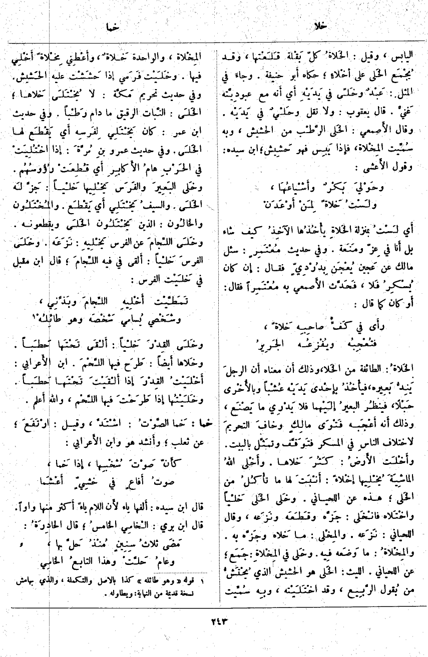 الْيَابِسِ، وَقِيلَ: الخَلاةُ كُلُّ بَقْلة قَلَعْتها، وَقَدْ يُجْمَع الخَلى عَلَى أَخْلاءٍ؛ حَكَاهُ أَبو حَنِيفَةَ. وجاءَ فِي الْمَثَلِ: عَبْدٌ وخَلىً فِي يَدَيْهِ أَي مَعَ عبودِيَّته غَنيٌّ. قَالَ يَعْقُوبُ: وَلَا تَقُلْ وحَلْيٌ فِي يَدَيْه. وَقَالَ الأَصمعي: الخَلى الرَّطْب من الحشيش، وَبِهِ سُمِّيت المِخْلاة، فَإِذَا يَبِس فَهُوَ حَشِيش؛ ابْنُ سِيدَهْ: وَقَوْلُ الأَعشى: