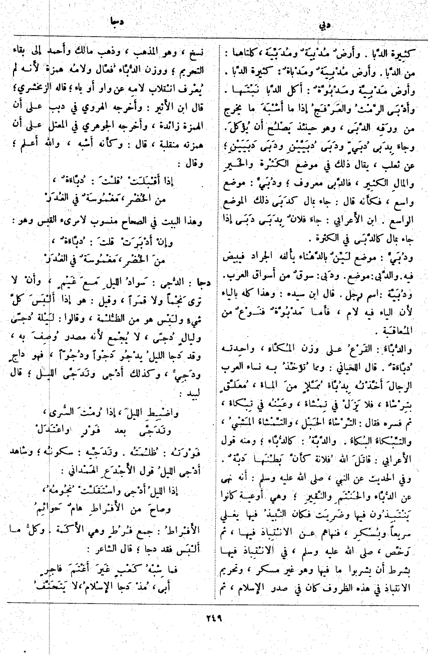 دجا: الدُّجى: سَوادُ الليلِ مَعَ غَيْمٍ، وأَنْ لَا تَرَى نَجْماً وَلَا قمَراً، وَقِيلَ: هُوَ إِذَا أَلْبَسَ كلَّ شيءٍ ولَيْس هُوَ مِنَ الظُّلْمة، وَقَالُوا: لَيْلة دُجىً وليالٍ دُجًى، لَا يُجْمع لأَنه مَصْدَرٌ وُصِفَ بِهِ، وَقَدْ دَجا الليلُ يَدْجُو دَجْواً ودُجُوّاً، فَهُوَ داجٍ ودَجِيٌّ، وَكَذَلِكَ أَدْجَى وتَدجَّى اللَّيْلُ؛ قَالَ لَبِيدٌ: