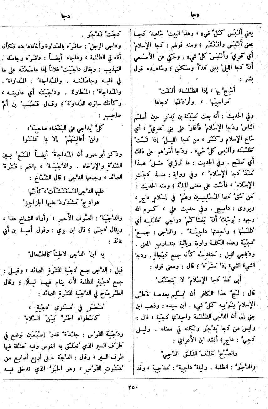 قَالَ: لَجَّ هَذَا الكافر أَن يُسْلِم بعد ما غَطَّى الإِسلامُ بثَوْبِه كُلّ شيءٍ. ابْنُ سِيدَهْ: وَذَهَبَ ابْنُ جِنِّي إِلَى أَن الدُّجى الظُّلْمة واحِدَتها دُجْيَة، قَالَ: وَلَيْسَ مِنْ دَجَا يَدْجُو وَلَكِنَّهُ فِي مَعْنَاهُ. وَلَيْلٌ دَجِيٌّ: داجٍ؛ أَنشد ابْنُ الأَعرابي:
