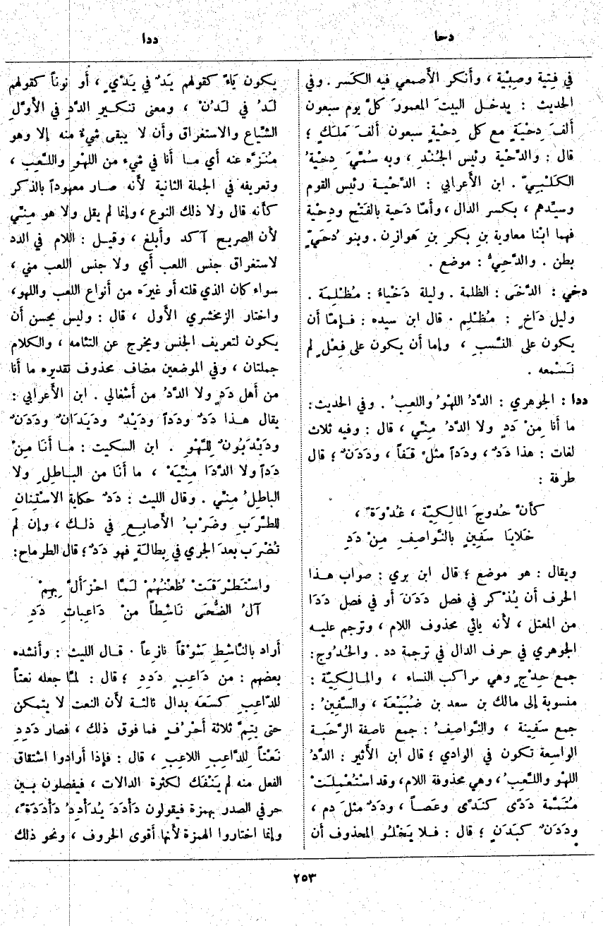 وَيُقَالُ: هُوَ مَوْضِعٌ؛ قَالَ ابْنُ بَرِّيٍّ: صَوَابُ هَذَا الْحَرْفِ أَنْ يُذْكر فِي فَصْلِ دَدَنَ أَو فِي فَصْلِ دَدَا مِنَ الْمُعْتَلِّ، لأَنه يَائِيٌّ مَحْذُوفُ اللَّامُ، وَتَرْجَمَ عَلَيْهِ الْجَوْهَرِيُّ فِي حَرْفِ الدَّالِ فِي تَرْجَمَةِ دَدَّ. والحُدُوج: جَمْعُ حِدْجٍ وَهِيَ مَرَاكِبُ النِّسَاءِ، والمالِكِيّة: مَنْسُوبَةٌ إِلَى مَالِكِ بْنِ سَعْدِ بْنِ ضُبَيْعَة، والسَّفِينُ: جَمْعُ سَفِينة، والنَّواصِفُ: جَمْعُ ناصِفة الرَّحَبة الواسِعة تَكُونُ فِي الْوَادِي؛ قَالَ ابْنُ الأَثير: الدَّدُ اللهْو واللَّعِبُ، وَهِيَ مَحْذُوفَةُ اللَّامِ، وَقَدِ اسْتُعْمِلَتْ مُتَمَّمة دَدىً كنَدىً وعَصاً، ودَدٌ مثلَ دَمٍ، ودَدَنٌ كبَدَنٍ؛ قَالَ: فَلَا يَخْلُو الْمَحْذُوفُ أَن يَكُونَ يَاءً كَقَوْلِهِمْ يَدٌ فِي يَدْيٍ، أَو نُونًا كَقَوْلِهِمْ لَدُ فِي لَدُنْ، وَمَعْنَى تنكيرِ الدَّدِ فِي الأَوَّلِ الشِّياع وَالِاسْتِغْرَاقُ وأَن لَا يَبْقَى شيءٌ مِنْهُ إِلَّا وَهُوَ مُنَزَّه عَنْهُ أَي مَا أَنَا فِي شَيْءٍ مِنَ اللهْوِ واللَّعِب، وَتَعْرِيفُهُ فِي الْجُمْلَةِ الثَّانِيَةِ لأَنه صَارَ مَعْهُودًا بِالذِّكْرِ كأَنه قَالَ وَلَا ذَلِكَ النَّوْعُ، وَإِنَّمَا لَمْ يَقُلْ وَلَا هُوَ مِنِّي لأَن الصَّرِيحَ آكَدُ وأَبلغ، وَقِيلَ: اللَّامُ فِي الدَّد لِاسْتِغْرَاقِ جِنْسِ اللَّعِبِ أَي ولا جنس اللعب مني، سواء كان الذي قُلْتُهُ أَوْ غيرَه مِنْ أَنواع اللَّعِبِ وَاللَّهْوِ، وَاخْتَارَ الزَّمَخْشَرِيُّ الأَول، قَالَ: وَلَيْسَ يَحْسُنُ أَن يَكُونَ لِتَعْرِيفِ الْجِنْسِ وَيَخْرُجُ عَنِ الْتِئَامِهِ، وَالْكَلَامُ جُمْلَتَانِ، وَفِي الْمَوْضِعَيْنِ مُضَافٌ مَحْذُوفٌ تَقْدِيرُهُ مَا أَنَا مِنْ أَهل دَدٍ وَلَا الدَّدُ مِنْ أَشغالي. ابْنُ الأَعرابي: يُقَالُ هَذَا دَدٌ ودَداً ودَيْدٌ ودَيَدَانٌ ودَدَنٌ ودَيْدَبُونٌ لِلَّهْوِ. ابْنُ السِّكِّيتِ: مَا أَنَا مِنْ دَداً وَلَا الدَّدَا مِنِّيَهْ، مَا أَنَا مِنَ الباطِلِ وَلَا الباطِلُ منِّي. وَقَالَ اللَّيْثُ: دَدٌ حِكَايَةُ الاسْتِنانِ للطَّرَبِ وضَرْبُ الأَصابِعِ فِي ذَلِكَ، وَإِنْ لَمْ تُضْرَب بعدَ الْجَرْيِ فِي بِطالَةٍ فَهُوَ دَدٌ؛ قَالَ الطِّرِمَّاحُ: