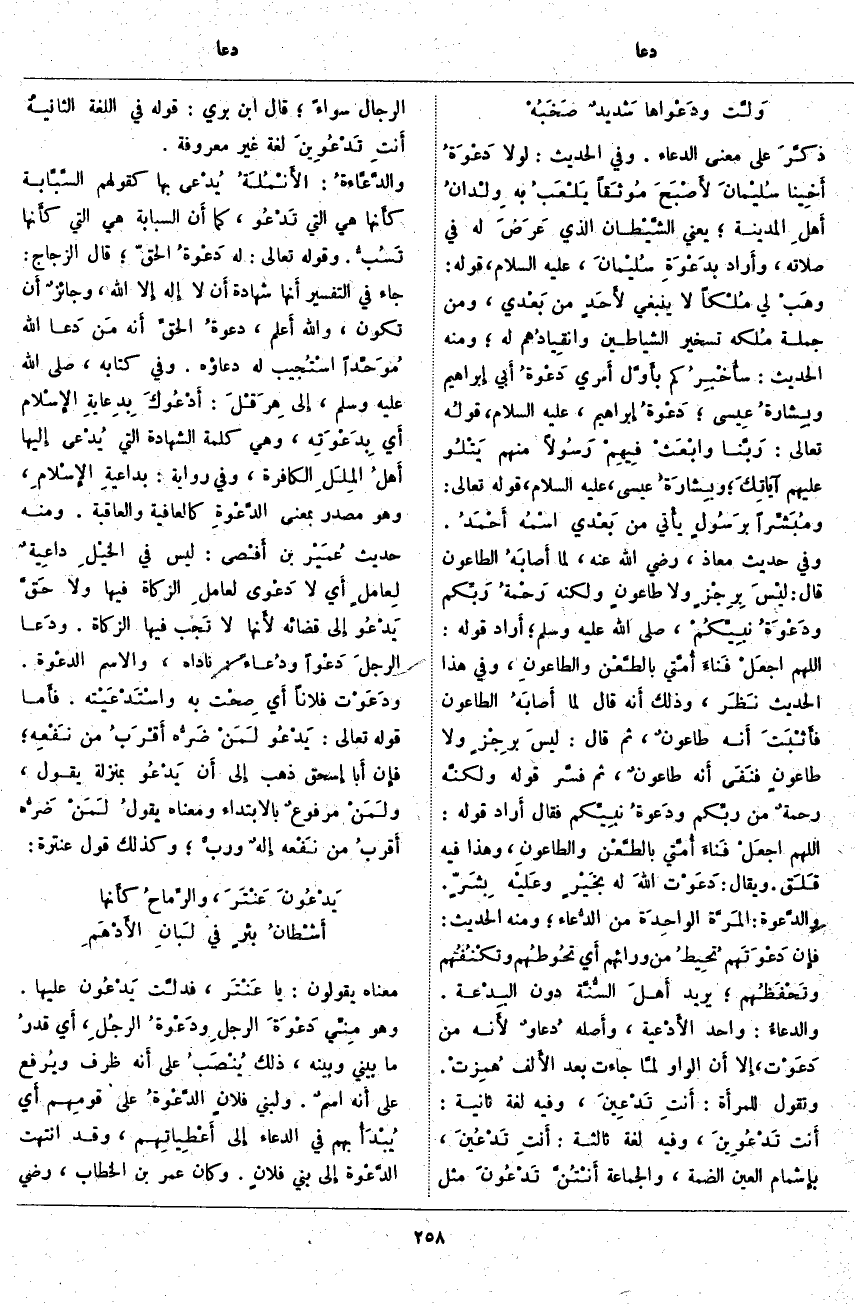 مَعْنَاهُ يَقُولُونَ: يَا عَنْتَر، فدلَّت يَدْعُون عَلَيْهَا. وَهُوَ مِنِّي دَعْوَةَ الرجلِ ودَعْوةُ الرجُلِ، أَي قدرُ مَا بَيْنِي وَبَيْنَهُ، ذلك يُنْصَبُ عَلَى أَنه ظَرْفٌ ويُرفع عَلَى أَنه اسمٌ. وَلِبَنِي فلانٍ الدَّعْوةُ عَلَى قومِهم أَي يُبْدأُ بِهِمْ فِي الدُّعَاءِ إِلَى أَعْطِياتِهم، وَقَدِ انْتَهَتِ الدَّعْوة إِلَى بَنِي فلانٍ.