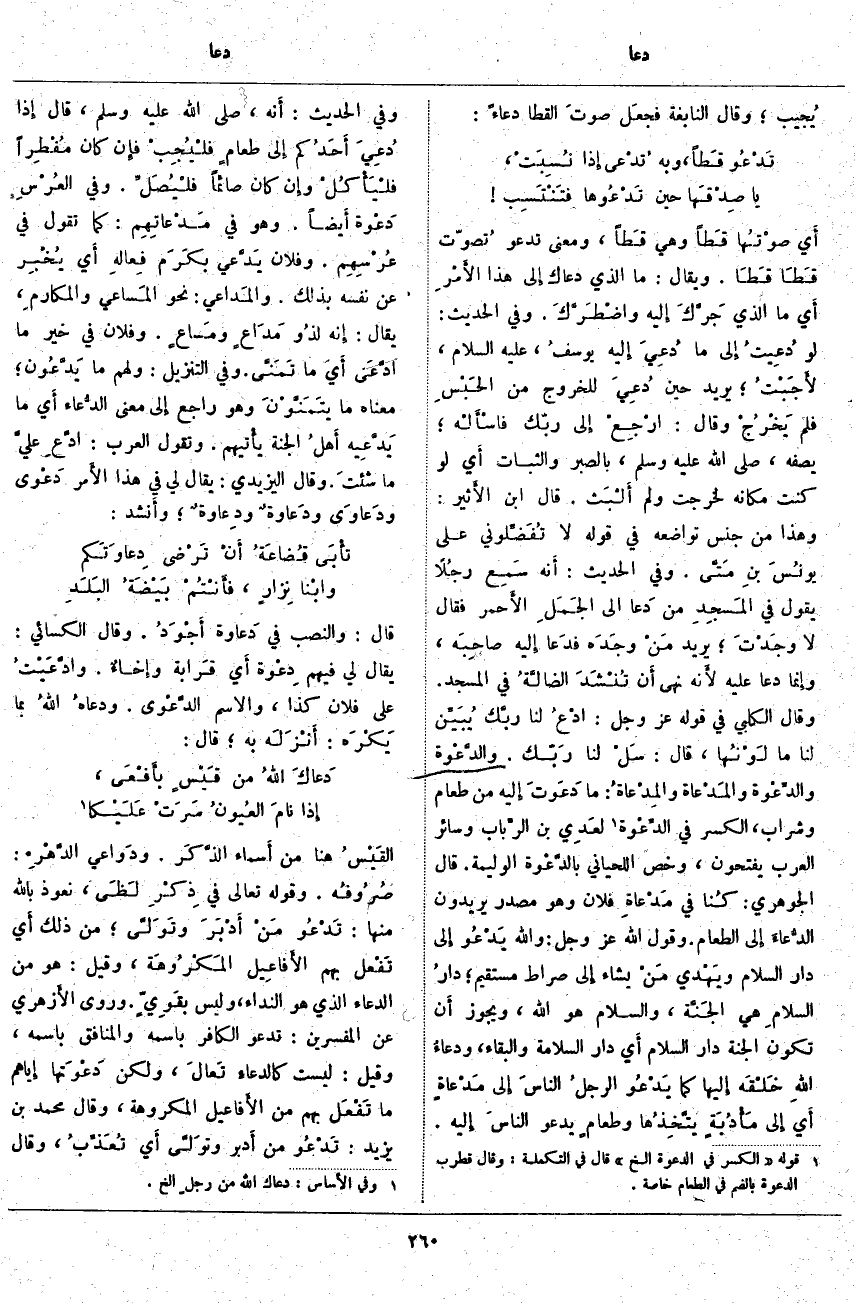 ، قَالَ: سَلْ لَنَا رَبّك. والدَّعْوة والدِّعْوة والمَدْعاة والمِدْعاةُ: مَا دَعَوتَ إِلَيْهِ مِنْ طَعَامٍ وَشَرَابٍ، الْكَسْرُ فِي الدِّعْوَة «3». لعَدِي بن الرِّباب وسائر العرب يَفْتَحُونَ، وَخَصَّ اللِّحْيَانِيُّ بالدَّعْوَة الْوَلِيمَةَ. قَالَ الْجَوْهَرِيُّ: كُنا فِي مَدْعَاةِ فُلَانٍ وَهُوَ مَصْدَرٌ يُرِيدُونَ الدُّعاءَ إِلَى الطَّعَامِ. وَقَوْلُ اللَّهِ عَزَّ وَجَلَّ: وَاللَّهُ يَدْعُوا إِلى دارِ السَّلامِ وَيَهْدِي مَنْ يَشاءُ إِلى صِراطٍ مُسْتَقِيمٍ