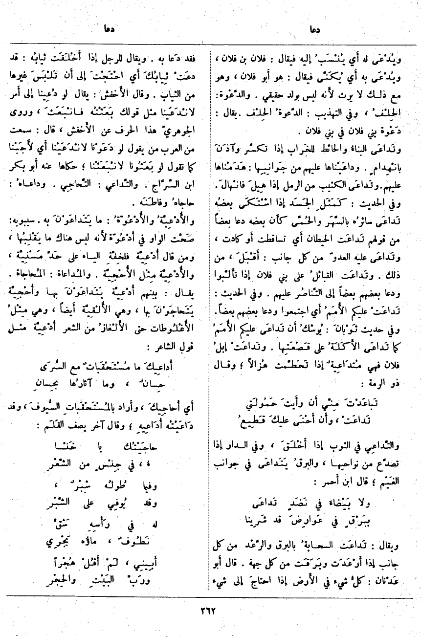 وَيُقَالُ: تَدَاعَت السحابةُ بِالْبَرْقِ والرَّعْد مِنْ كُلِّ جَانِبٍ إِذَا أَرْعَدَت وبَرَقَت مِنْ كُلِّ جِهَةٍ. قَالَ أَبو عَدْنان: كلُّ شَيْءٍ فِي الأَرض إِذَا احتاجَ إِلَى شَيْءٍ فَقَدْ دَعا بِهِ. وَيُقَالُ لِلرَّجُلِ إِذَا أَخْلَقَت ثيابُه: قَدْ دَعَتْ ثِيابُكَ أَي احْتَجْتَ إِلَى أَن تَلْبَسَ غَيْرَهَا مِنَ الثِّيَابِ. وَقَالَ الأَخفش: يُقَالُ لَوْ دُعِينَا إِلَى أَمر لانْدَعَينا مِثْلَ قَوْلِكَ بَعَثْتُه فانْبَعَثَ، وَرَوَى الْجَوْهَرِيُّ هَذَا الْحَرْفَ عَنِ الأَخفش، قَالَ: سَمِعْتُ مِنَ الْعَرَبِ مَنْ يَقُولُ لَوْ دَعَوْنا لانْدَعَيْنا أَي لأَجَبْنا كَمَا تَقُولُ لَوْ بَعَثُونا لانْبَعَثْنا؛ حَكَاهَا عَنْهُ أَبو بَكْرِ ابن السَّرَّاج. والتَّداعِي: التَّحاجِي. ودَاعَاهُ: حاجاهُ وفاطَنَه. والأُدْعِيَّةُ والأُدْعُوَّةُ: مَا يَتَداعَوْنَ بِهِ. سِيبَوَيْهِ: صَحَّت الْوَاوُ فِي أُدْعُوَّة لأَنه لَيْسَ هُنَاكَ مَا يَقْلِبُها، وَمَنْ قَالَ أُدْعِيَّة فلخِفَّةِ الْيَاءِ عَلَى حَدِّ مَسْنِيَّة، والأُدْعِيَّة مِثْل الأُحْجِيَّة. والمُدَاعَاة: المُحاجاة. يُقَالُ: بَيْنَهُمْ أُدْعِيَّة يَتَداعَوْنَ بِهَا وأُحْجِيَّة يَتَحاجَوْنَ بِهَا، وَهِيَ الأُلْقِيَّة أَيضاً، وَهِيَ مِثْلُ الأُغْلُوطات حَتَّى الأَلْغازُ مِنَ الشِّعْرِ أُدْعِيَّة مِثْلُ قَوْلِ الشَّاعِرِ: