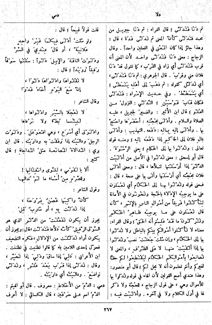 يَجُوزُ أَن يَكُونَ تَفَعَّلَتْ مِنَ الدَّلْوِ الَّذِي هُوَ السَّوْق الرَّفِيقُ كأَنَّه دَلَّاها فَتَدَلَّت، قَالَ: وَيَجُوزُ أَن يَكُونَ أَراد تَدَلَّلَت مِنَ الإِدْلالِ، فَكُرِهَ التَّضْعِيفُ فَحَوَّلَ إِحْدَى اللامين ياء كما قالو تَظَنَّيْتُ فِي تَظَنَّنْتُ. ابْنُ الأَعرابي: دَلِيَ إِذَا ساقَ ودَلِيَ إِذَا تَحَيَّر، وَقَالَ: تَدَلَّى إِذَا قَرُب بَعْدَ عُلْوٍ، وتَدَلَّى تواضَعَ. ودَالَيْتُه أَي دارَيْتُه.
