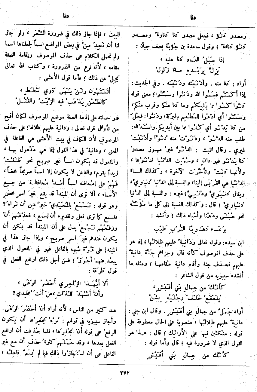 ؛ إِنَّمَا هُوَ عَلَى حَذْفِ الْمَوْصُوفِ كَأَنَّهُ قَالَ وَجَزَاهُمْ جَنَّة دَانِيَةً عَلَيْهِمْ فَحَذَفَ جَنَّةً وأَقام دَانِيَةً مُقامها؛ وَمِثْلُهُ مَا أَنشده سِيبَوَيْهِ مِنْ قَوْلِ الشَّاعِرِ: