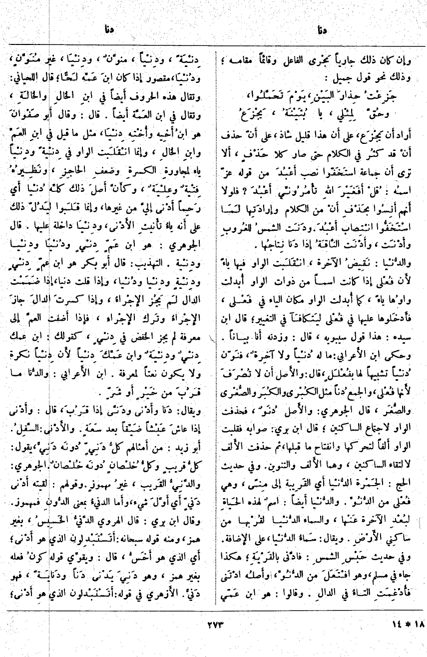 أَراد أَن يَجْزَع، عَلَى أَن هَذَا قَلِيلٌ شَاذٌّ، عَلَى أَنّ حَذْفَ أَنْ قَدْ كثُر فِي الْكَلَامِ حَتَّى صَارَ كِلَا حَذْفٍ، أَلا تَرَى أَن جَمَاعَةً استَخَفّوا نَصْبَ أَعْبُدَ مِنْ قَوْلِهِ عَزَّ اسمُه: قُلْ أَفَغَيْرَ اللَّهِ تَأْمُرُونِّي أَعْبُدُ؟ فَلَوْلَا أَنهم أَنِسُوا بحَذْفِ أَنْ مِنَ الْكَلَامِ وإِرادَتِها لَمَا اسْتَخَفُّوا انْتِصاب أَعْبُدَ. ودَنَت الشمسُ للغُروبِ وأَدْنَت، وأَدْنَت النَّاقَةُ إِذا دَنا نِتاجُها. والدُّنْيا: نَقِيضُ الْآخِرَةِ، انْقَلَبت الْوَاوُ فِيهَا يَاءً لأَن فُعْلى إِذا كَانَتِ اسْمًا مِنْ ذَوَاتِ الْوَاوِ أُبدلت واوُها يَاءً، كَمَا أُبدلت الْوَاوُ مَكَانَ الْيَاءِ فِي فَعْلى، فأَدخَلوها عَلَيْهَا فِي فُعْلى ليَتكافآ فِي التَّغْيِيرِ؛ قَالَ ابْنُ سِيدَهْ: هَذَا قَوْلُ سِيبَوَيْهِ، قَالَ: وَزِدْتُهُ أَنا بَيَانًا. وَحَكَى ابْنُ الأَعرابي: مَا لَهُ دُنْياً وَلَا آخِرةٌ، فنَوّن دُنْياً تَشْبِيهًا لَهَا بفُعْلَلٍ، قَالَ: والأَصل أَن لَا تُصْرَفَ لأَنها فُعْلى، وَالْجَمْعُ دُناً مِثْلُ الكُبْرى والكُبَر والصُّغْرى والصُّغَر، قَالَ الْجَوْهَرِيُّ: والأَصل دُنَوٌ، فَحُذِفَتِ الْوَاوُ لِاجْتِمَاعِ السَّاكِنَيْنِ؛ قَالَ ابْنُ بَرِّيٍّ: صَوَابُهُ فَقُلِبَتِ الْوَاوُ أَلفاً لِتَحَرُّكِهَا وَانْفِتَاحِ مَا قَبْلَهَا، ثُمَّ حُذِفَتِ الأَلف لِالْتِقَاءِ السَّاكِنَيْنِ، وَهُمَا الأَلف وَالتَّنْوِينُ. وَفِي حَدِيثِ الْحَجِّ: