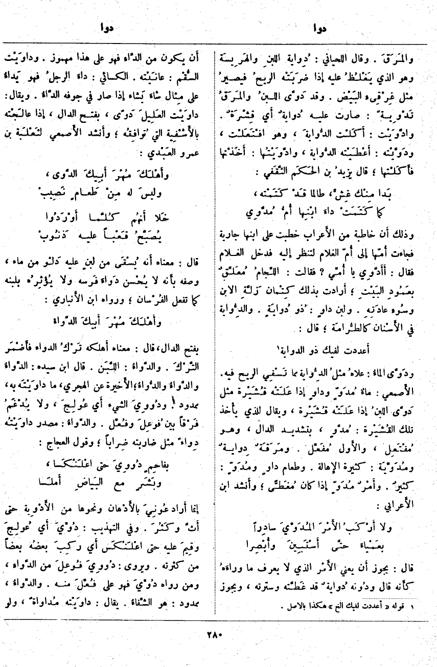 بِفَتْحِ الدَّالِ، قَالَ: مَعْنَاهُ أَهلكه تَرْكُ الدَّوَاءِ فأَضْمَر التَّرْكَ. والدَّواءُ: اللَّبَن. قَالَ ابْنُ سِيدَهْ: الدِّوَاءُ والدَّوَاءُ والدُّوَاءُ؛ الأَخيرة عَنِ الْهَجَرِيِّ، مَا داوَيْتَه بِهِ، مَمْدُودٌ. ودُووِيَ الشَّيْءُ أَي عُولِجَ، وَلَا يُدْغَمُ فَرْقاً بَيْنَ فُوعِلَ وفُعِّل. والدِّوَاءُ: مَصْدَرُ دَاوَيْتُه دِوَاءً مِثْلُ ضَارَبْتُهُ ضِراباً؛ وَقَوْلُ الْعَجَّاجِ: