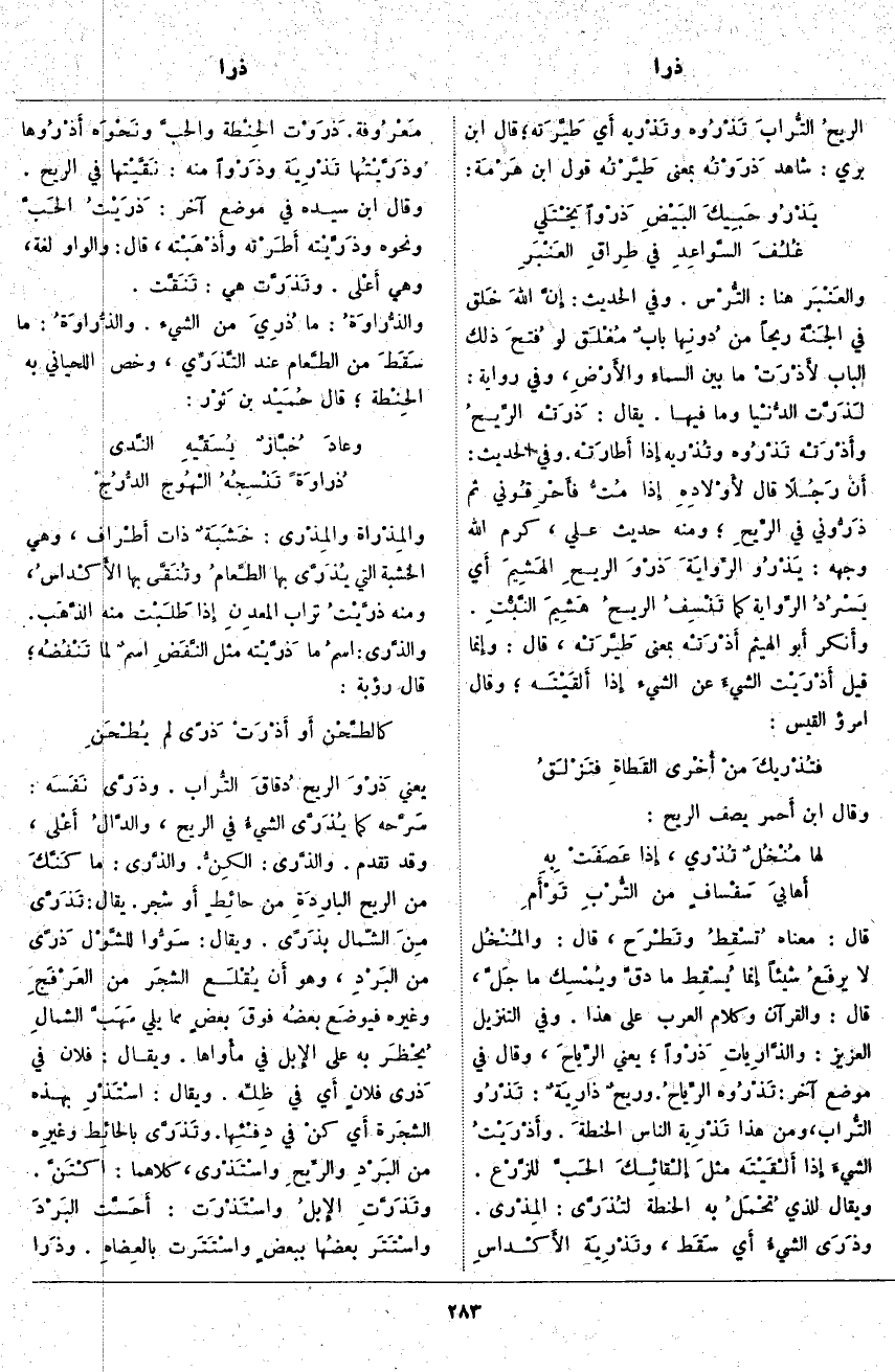 . وريحٌ ذَارِيَةٌ: تَذْرُو التُّراب، وَمِنْ هَذَا تَذْرِية النَّاسِ الحنطةَ. وأَذْرَيْتُ الشيءَ إِذا أَلْقَيْتَه مثلَ إِلْقائِكَ الحَبَّ للزَّرْع. وَيُقَالُ لِلَّذِي تُحْمَلُ بِهِ الْحِنْطَةُ لتُذَرَّى: المِذْرَى. وذَرَى الشيءُ أَي سَقَط، وتَذْرِيَة الأَكْداسِ مَعْرُوفة. ذَرَوْت الحِنْطة والحبَّ ونَحْوَه أَذْرُوها وذَرَّيْتُها تَذْرِيَة وذَرْواً مِنْهُ: نَقَّيْتها فِي الرِّيحِ. وَقَالَ ابْنُ سِيدَهْ فِي مَوْضِعٍ آخَرَ: ذَرَيْتُ الحَبَّ وَنَحْوَهُ وذَرَّيْته أَطَرْته وأَذْهَبْته، قَالَ: وَالْوَاوُ لُغَةٌ وَهِيَ أَعْلى. وتَذَرَّت هي: تَنَقَّت. والذُّرَاوَةُ: مَا ذُرِيَ مِنَ الشَّيْءِ. والذُّرَاوَةُ: مَا سَقَطَ مِنَ الطَّعام عِنْدَ التَّذَرِّي، وَخَصَّ اللِّحْيَانِيُّ بِهِ الحِنْطة؛ قَالَ حُمَيْد بْنُ ثوْر: