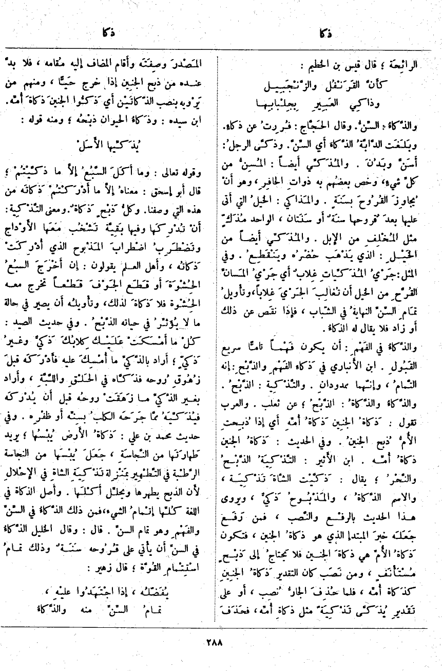 ؛ قَالَ أَبو إِسْحَاقَ: معناهُ إلَّاما أَدْرَكْتُمْ ذَكَاتَه مِنْ هَذِهِ الَّتِي وَصَفْنَا. وكلُّ ذَبْحٍ ذَكاةٌ. وَمَعْنَى التَّذْكِية: أَنْ تُدْرِكَها وَفِيهَا بَقِيَّة تَشْخُب مَعَها الأَوْداج وتَضْطَرِبُ اضْطرابَ المَذْبوح الَّذِي أُدْرِكَتْ ذَكاتُه، وأَهل الْعِلْمِ يَقُولُونَ: إِنْ أَخْرَجَ السبُعُ الحِشْوَةَ [الحُشْوَةَ] أَو قَطَع الجَوْفَ قَطْعاً تَخْرُجُ مَعَهُ الحِشْوة [الحُشْوة] فَلَا ذَكاةَ لِذَلِكَ، وتأْويلُه أَن يَصِيرَ فِي حَالَةِ مَا لَا يُؤَثِّرُ فِي حَيَاتِهِ الذَّبْحُ. وَفِي حَدِيثِ الصَّيْدِ: