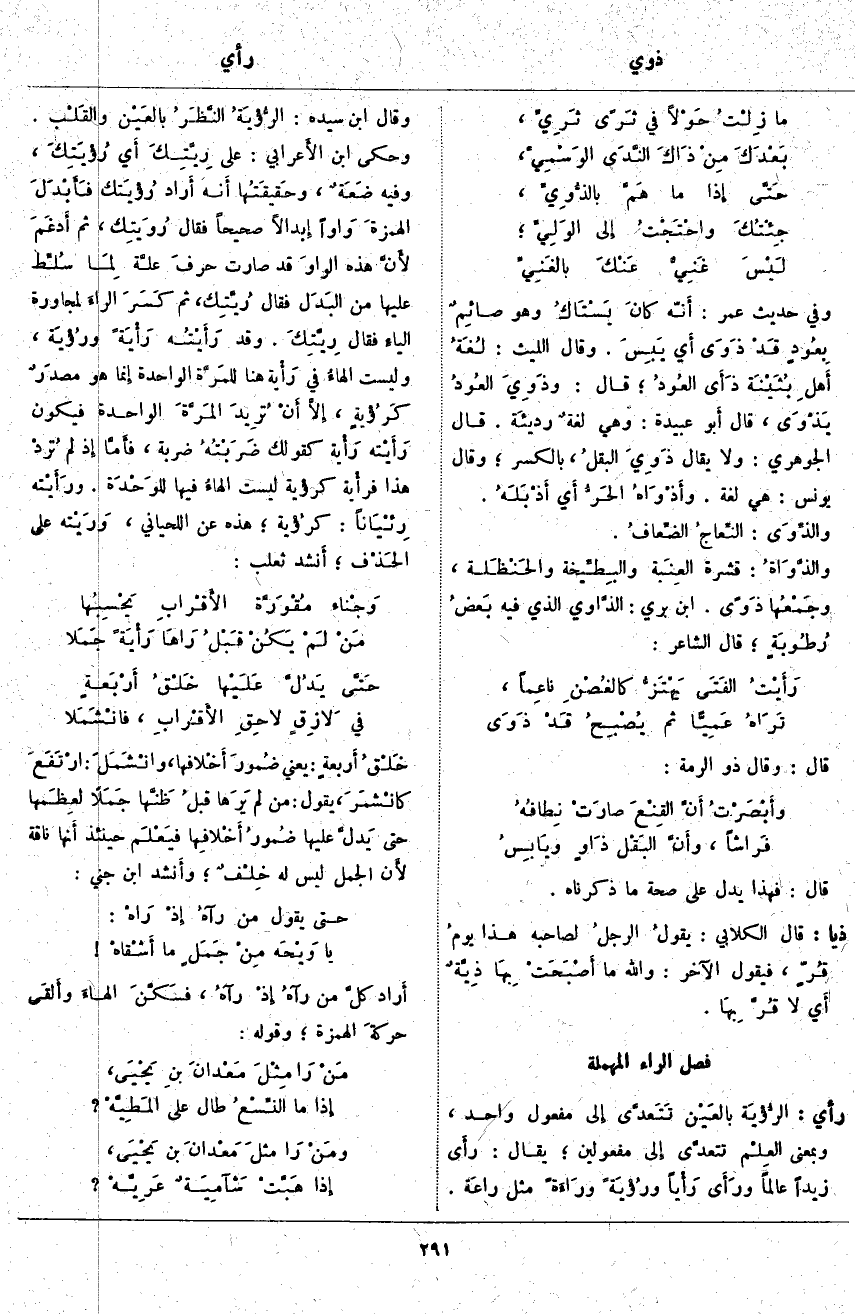 رأي: الرُّؤْيَة بالعَيْن تَتَعدَّى إِلَى مَفْعُولٍ وَاحِدٍ، وَبِمَعْنَى العِلْم تتعدَّى إِلَى مَفْعُولَيْنِ؛ يُقَالُ: رَأَى زَيْدًا عَالِمًا ورَأَى رَأْياً ورُؤْيَةً ورَاءَةً مِثْلُ راعَة. وَقَالَ ابْنُ سِيدَهْ: الرُّؤْيَةُ النَّظَرُ بالعَيْن والقَلْب. وَحَكَى ابْنُ الأَعرابي: عَلَى رِيَّتِكَ أَي رُؤيَتِكَ، وفيه ضَعَةٌ، وحَقيقَتُها أَنه أَراد رُؤيَتك فَأبْدَلَ الهمزةَ وَاوًا إِبْدَالًا صَحِيحًا فَقَالَ رُويَتِك، ثُمَّ أَدغَمَ لأَنَّ هَذِهِ الواوَ قَدْ صَارَتْ حرفَ علَّة لمَا سُلِّط عَلَيْهَا مِنَ البَدَل فَقَالَ رُيَّتِك، ثُمَّ كَسَرَ الراءَ لِمُجَاوِرَةِ الْيَاءِ فَقَالَ رِيَّتِكَ. وَقَدْ رَأَيْتُه رَأْيَةً ورُؤْيَة، وَلَيْسَتِ الهاءُ فِي رَأْيَة هُنَا للمَرَّة الْوَاحِدَةِ إِنَّمَا هُوَ مصدَرٌ كَرُؤيةٍ، إلَّا أَنْ تُرِيدَ المَرَّةَ الْوَاحِدَةَ فَيَكُونَ رَأَيْته رَأْية كَقَوْلِكَ ضَرَبْتُه ضربة، فأَمَّا إذ لَمْ تُردْ هَذَا فرأْية كرؤْية لَيْسَتِ الهاءُ فِيهَا للوَحْدَة. ورَأَيْته رِئْيَاناً: كرُؤْية؛ هَذِهِ عَنِ اللِّحْيَانِيِّ، وَرَيْتُهُ عَلَى الحَذْف؛ أَنشد ثَعْلَبٌ: