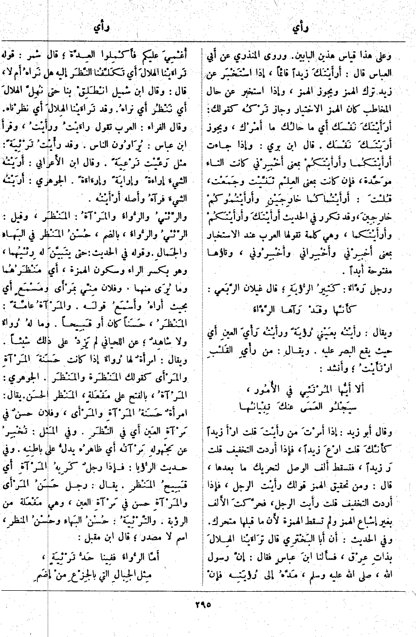 وَعَلَى هَذَا قِيَاسُ هَذَيْنِ الْبَابَيْنِ. وَرَوَى الْمُنْذِرِيُّ عَنْ أَبي الْعَبَّاسِ قَالَ: أَرأَيْتَكَ زَيْدًا قَائِمًا، إِذَا اسْتَخْبَر عَنْ زَيْدٍ تَرَكَ الْهَمْزَ وَيَجُوزُ الْهَمْزُ، وَإِذَا اسْتَخْبَرَ عَنْ حَالِ الْمُخَاطَبِ كَانَ الْهَمْزُ الِاخْتِيَارَ وَجَازَ تَرْكُه كَقَوْلِكَ: أَرَأَيْتَكَ نَفْسَك أَي مَا حالُك مَا أَمْرُك، وَيَجُوزُ أَرَيْتَكَ نَفْسَك. قَالَ ابْنُ بَرِّيٍّ: وَإِذَا جَاءَتْ أَرأَيْتَكُما وأَ رأَيْتَكُمْ بِمَعْنَى أَخْبِرْني كَانَتِ التَّاءُ موَحَّدة، فَإِنْ كَانَتْ بِمَعْنَى العِلْم ثَنَّيْت وجَمَعْت، قُلْتَ: أَرأَيْتُماكُما خارِجَيْنِ وأَ رأَيْتُمُوكُمْ خارِجِينَ، وَقَدْ تَكَرَّرَ فِي الْحَدِيثِ أَرأَيْتَكَ وأَ رأيْتَكُمْ وأَ رأَيْتَكما، وَهِيَ كَلِمَةٌ تَقُولُهَا الْعَرَبُ عِنْدَ الِاسْتِخْبَارِ بِمَعْنَى أَخبِرْني وأَخْبِراني وأَخْبِرُوني، وتاؤُها مَفْتُوحَةٌ أَبداً. وَرَجُلٌ رَءَّاءٌ: كَثيِرُ الرُّؤيَةِ؛ قَالَ غِيلَانُ الرَّبَعي: