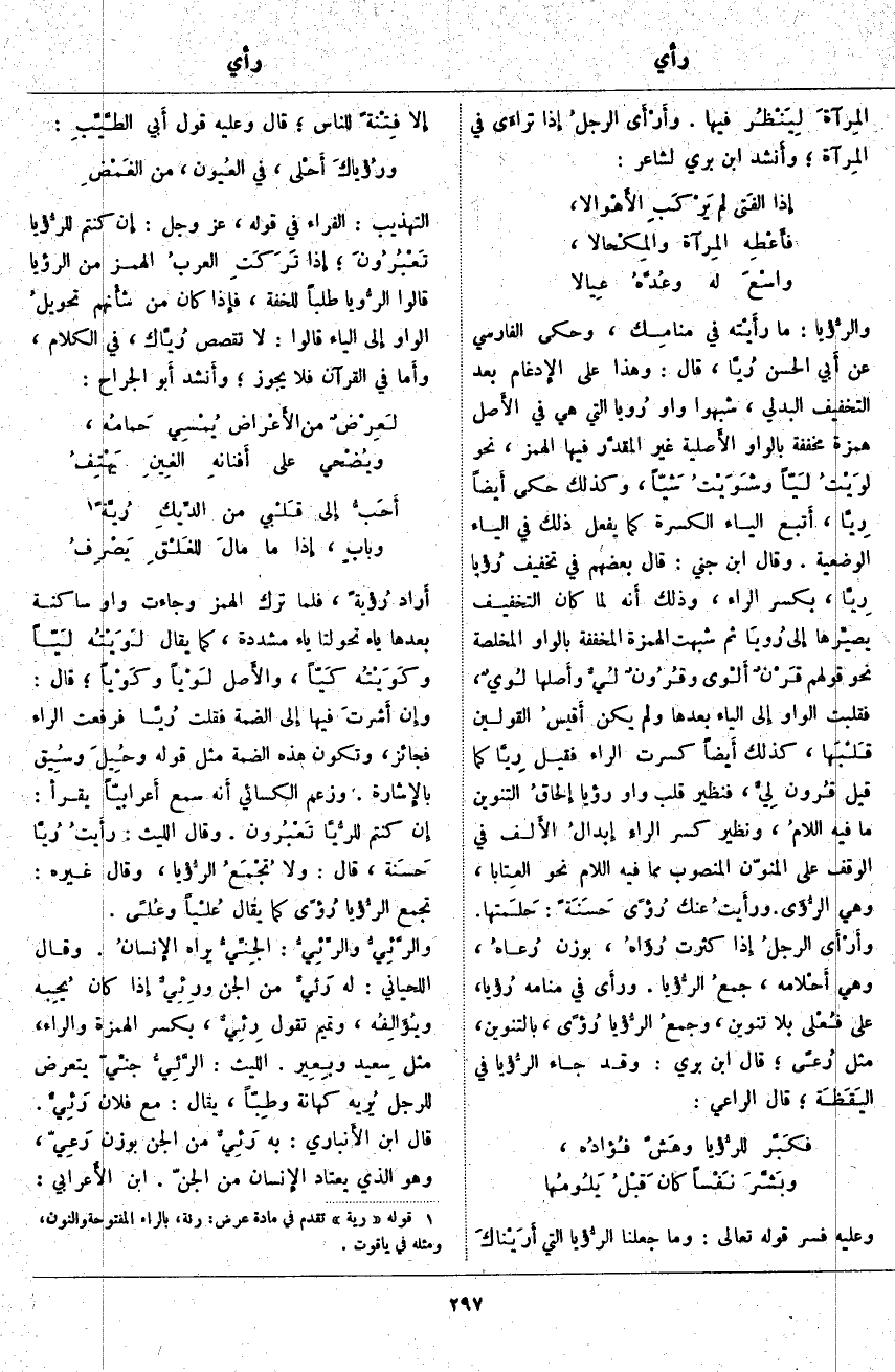 والرُّؤْيا: مَا رأَيْته فِي منامِك، وَحَكَى الْفَارِسِيُّ عَنْ أَبي الْحَسَنِ رُيَّا، قَالَ: وَهَذَا عَلَى الإِدغام بَعْدَ التَّخْفِيفِ الْبَدَلِيِّ، شَبَّهُوا وَاوَ رُويا الَّتِي هِيَ فِي الأَصل هَمْزَةٌ مُخَفَّفَةٌ بِالْوَاوِ الأَصلية غَيْرِ المقدَّر فِيهَا الْهَمْزُ، نَحْوُ لوَيْتُ لَيّاً وشَوَيْتُ شَيّاً، وَكَذَلِكَ حَكَى أَيضاً رِيَّا، أَتبع الْيَاءَ الْكَسْرَةَ كَمَا يَفْعَلُ ذَلِكَ فِي الْيَاءِ الْوَضْعِيَّةِ. وَقَالَ ابْنُ جِنِّي: قَالَ بَعْضُهُمْ فِي تَخْفِيفِ رُؤْيا رِيَّا، بِكَسْرِ الرَّاءِ، وَذَلِكَ أَنه لَمَّا كَانَ التَّخْفِيفُ يصيِّرها إِلى رُويَا ثُمَّ شُبِّهَتِ الْهَمْزَةُ الْمُخَفَّفَةُ بِالْوَاوِ الْمُخَلَّصَةِ نَحْوُ قَوْلِهِمْ قَرْنٌ أَلْوى وقُرُونٌ لُيٌّ وأَصلها لُويٌ، فَقُلِبَتِ الْوَاوُ إِلى الْيَاءِ بَعْدَهَا وَلَمْ يَكُنْ أَقيسُ الْقَوْلَيْنِ قَلْبَها، كَذَلِكَ أَيضاً كُسِرَتِ الرَّاءُ فَقِيلَ رِيَّا كَمَا قِيلَ قُرون لِيٌّ، فَنَظِيرُ قَلْبِ وَاوِ رُؤْيَا إِلحاقُ التَّنْوِينِ مَا فِيهِ اللامُ، وَنَظِيرُ كَسْرِ الراءِ إِبدالُ الأَلف فِي الْوَقْفِ عَلَى الْمُنَوَّنِ الْمَنْصُوبِ مِمَّا فِيهِ اللَّامُ نَحْوُ العِتابا، وَهِيَ الرُّؤَى. ورأَيتُ عَنْكَ رُؤىً حَسَنَةً: حَلَمتها. وأَرْأَى الرجلُ إِذا كَثُرَتْ رُؤَاهُ، بِوَزْنِ رُعاهُ، وَهِيَ أَحْلامه، جمعُ الرُّؤْيا. ورَأَى فِي مَنَامِهِ رُؤْيا، عَلَى فُعْلى بِلَا تَنْوِينٍ، وجمعُ الرُّؤْيا رُؤىً، بِالتَّنْوِينِ، مِثْلُ رُعىً؛ قَالَ ابْنُ بَرِّيٍّ: وَقَدْ جَاءَ الرُّؤْيا فِي اليَقَظَة؛ قَالَ الرَّاعِي:
