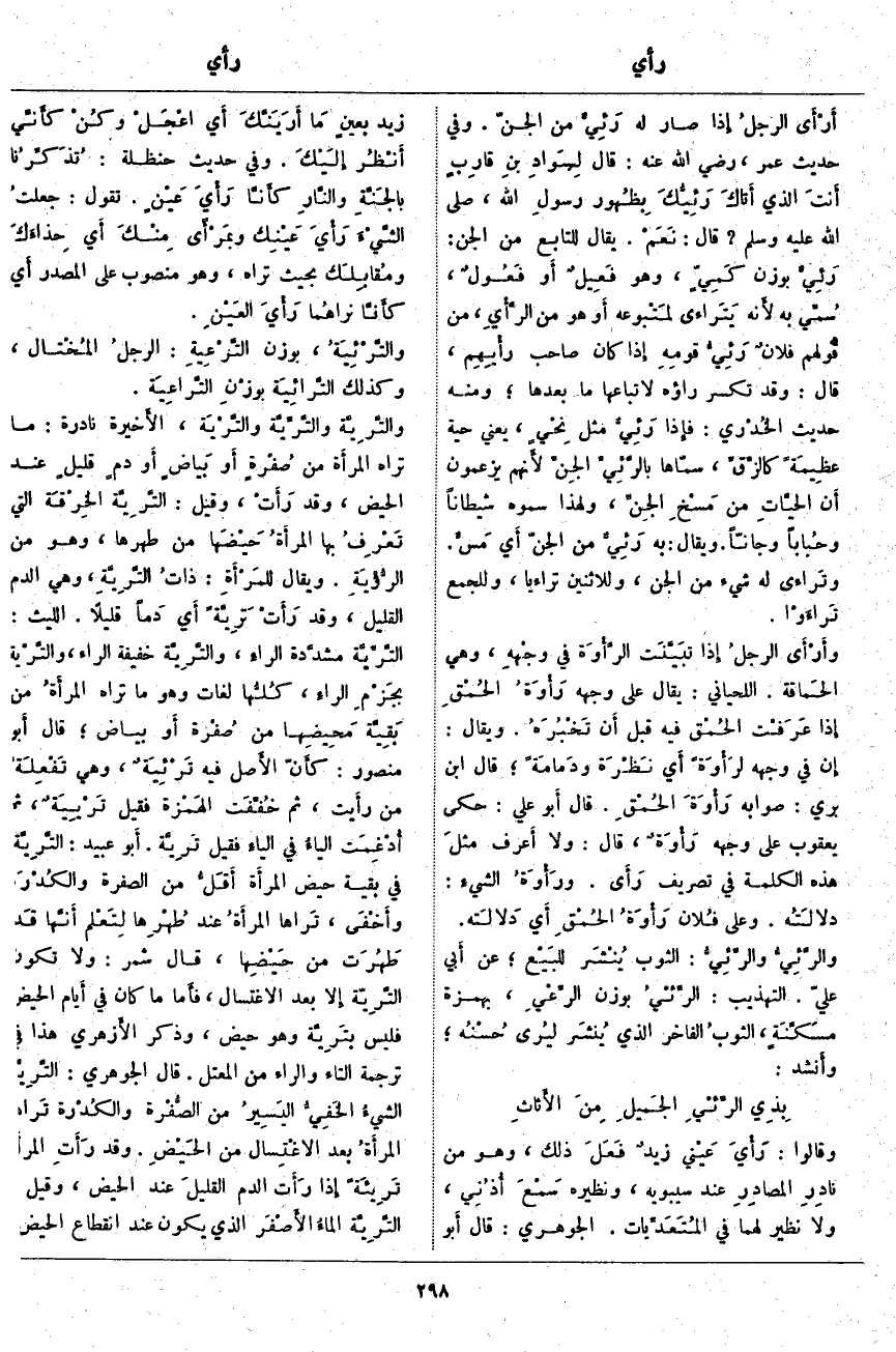 تَقُولُ: جعلتُ الشَّيْءَ رَأْيَ عَيْنِك وبمَرْأًى مِنْكَ أَي حِذاءَكَ ومُقابِلَك بِحَيْثُ تَرَاهُ، وَهُوَ مَنْصُوبٌ عَلَى الْمَصْدَرِ أَي كأَنَّا نراهُما رَأْيَ العَيْنِ. والتَّرْئِيَةُ، بِوَزْنِ التَّرْعِيةِ: الرجلُ المُخْتال، وَكَذَلِكَ التَّرَائِيَة بوزْنِ التَّراعِيَة. والتَّرِيَّة والتَّرِّيَّة والتَّرْيَة، الأَخيرة نَادِرَةٌ: مَا تَرَاهُ المرأَة مِنْ صُفْرةٍ أَو بَياضٍ أَو دمٍ قليلٍ عِنْدَ الْحَيْضِ، وَقَدْ رَأَتْ، وَقِيلَ: التَّرِيَّة الخِرْقَة الَّتِي تَعْرِفُ بِهَا المرأَةُ حَيْضَها مِنْ طُهْرِهَا، وَهُوَ مِنَ الرُّؤْيَةِ. وَيُقَالُ للمَرْأَةِ: ذاتُ التَّرِيَّةِ، وَهِيَ الدَّمُ الْقَلِيلُ، وَقَدْ رَأَتْ تَرِيَّةً أَي دَماً قَلِيلًا. اللَّيْثُ: التَّرِّيَّة مشدَّدة الرَّاءِ، والتَّرِيَّة خَفِيفَةُ الرَّاءِ، والتَّرْية بجَزْمِ الرَّاءِ، كُلُّها لُغَاتٌ وَهُوَ مَا تَرَاهُ المرأَةُ مِنْ بَقِيَّة مَحِيضِها مِنْ صُفْرة أَو بَيَاضٍ؛ قَالَ أَبو مَنْصُورٍ: كأَنّ الأَصل فِيهِ تَرْئِيَةٌ، وَهِيَ تَفْعِلَةٌ مِنْ رأَيت، ثُمَّ خُفِّفَت الهَمْزة فَقِيلَ تَرْيِيَةٌ، ثُمَّ أُدْغِمَت الياءُ فِي الْيَاءِ فَقِيلَ تَرِيَّة. أَبو عُبِيدٍ: التَّرِيَّةُ فِي بَقِيَّةِ حَيْضِ المرأَة أَقَلُّ مِنَ الصُّفْرَةِ والكُدْرَة وأَخْفَى، تَراها المرأَةُ عِنْدَ طُهْرِها لِتَعْلم أَنَّها قَدْ طَهُرَت مِنْ حَيْضِها، قَالَ شَمِرٌ: وَلَا تَكُونُ التَّرِيَّة إِلا بَعْدَ الِاغْتِسَالِ، فأَما مَا كَانَ فِي أَيام الْحَيْضِ فَلَيْسَ بتَرِيَّة وَهُوَ حَيْضٌ، وَذَكَرَ الأَزهري هَذَا فِي تَرْجَمَةِ التَّاءِ وَالرَّاءِ مِنَ الْمُعْتَلِّ. قَالَ الْجَوْهَرِيُّ: التَّرِيَّة الشيءُ الخَفِيُّ اليَسيِرُ مِنَ الصُّفْرة والكْدْرة تَراها المرأَةُ بَعْدَ الاغْتِسال مِنَ الحَيْضِ. وَقَدْ رَأَتِ المرأَة تَرِيئَةً إِذا رَأَت الدَّمَ القليلَ عِنْدَ الْحَيْضِ، وَقِيلَ: التَّرِيَّة الماءُ الأَصْفَر الَّذِي يَكُونُ عِنْدَ انْقِطَاعِ الْحَيْضِ.