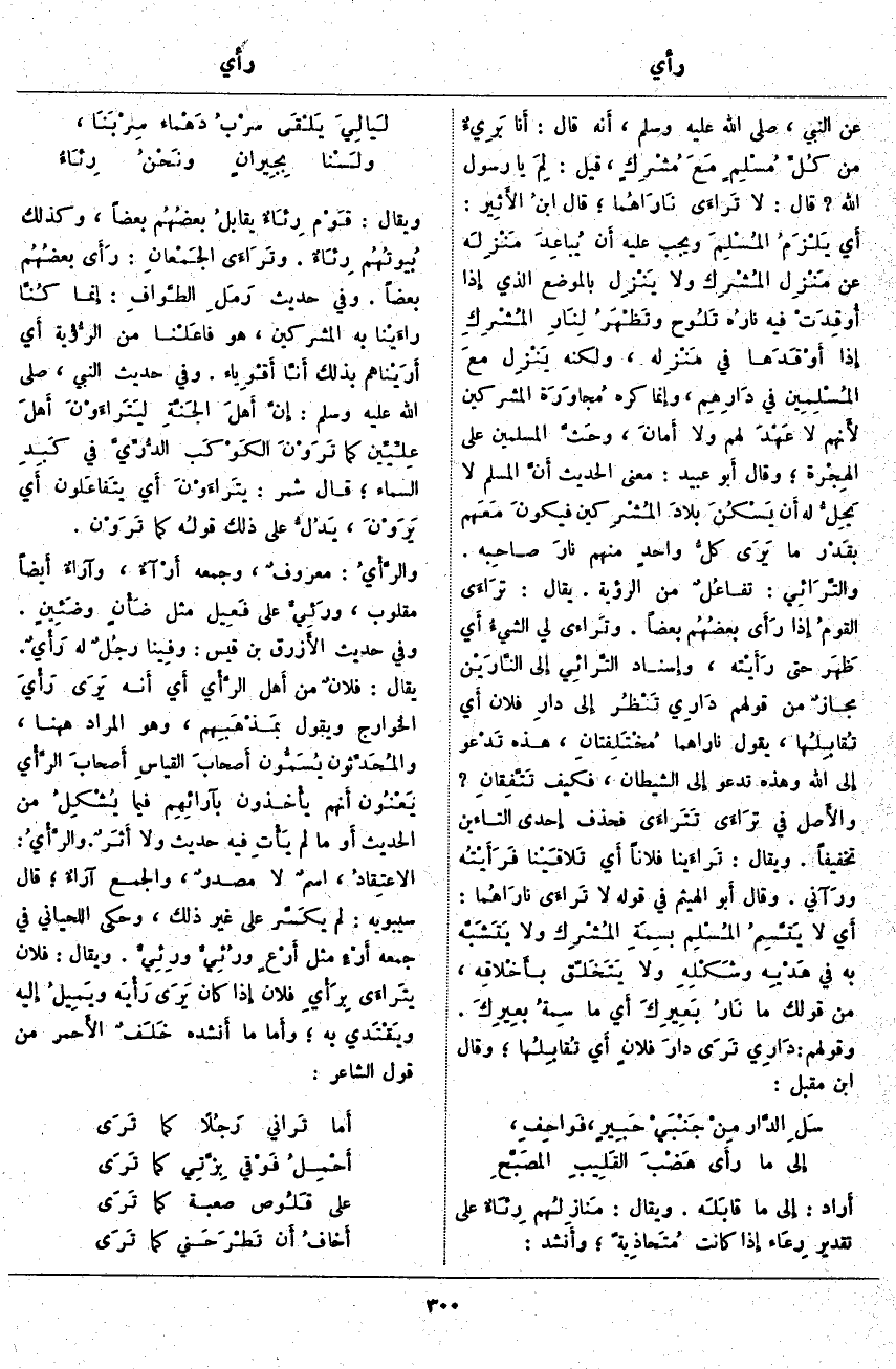؛ قَالَ ابنُ الأَثِير: أَي يَلْزَمُ المُسْلِمَ وَيَجِبُ عَلَيْهِ أَن يُباعِدَ مَنْزِلَه عَنْ مَنْزِل المُشْرِك وَلَا يَنْزِل بِالْمَوْضِعِ الَّذِي إِذا أُوقِدَتْ فِيهِ نارُه تَلُوح وتَظْهَرُ لِنَارِ المُشْرِكِ إِذا أَوْقَدَها فِي مَنْزِله، وَلَكِنَّهُ يَنْزِل معَ المُسْلِمِين فِي دَارِهِم، وإِنما كَرِهَ مُجاوَرَة الْمُشْرِكِينَ لأَنهم لَا عَهْدَ لَهُمْ وَلَا أَمانَ، وحَثَّ الْمُسْلِمِينَ عَلَى الهِجْرة؛ وَقَالَ أَبو عُبَيْدٍ: مَعْنَى الْحَدِيثِ أَنَّ الْمُسْلِمَ لَا يَحِلُّ لَهُ أَن يَسْكُنَ بلادَ المُشْرِكين فيكونَ مَعَهم بقَدْر مَا يَرَى كلُّ واحدٍ مِنْهُمْ نارَ صاحِبه. والتَّرَائِي: تفاعُلٌ مِنَ الرُّؤْيَةِ. يُقَالُ: تَرَاءَى القومُ إِذا رَأَى بعضُهُم بَعْضًا. وتَرَاءَى لِي الشيءُ أَي ظَهَر حَتَّى رَأَيْته، وإِسناد التَّرائِي إِلى النَّارَيْن مجازٌ مِنْ قَوْلِهِمْ دَارِي تَنْظُر إِلى دارِ فُلَانٍ أَي تُقابِلُها، يَقُولُ نَارَاهُمَا مُخْتَلِفتانِ، هَذِهِ تَدْعو إِلى اللَّهِ وَهَذِهِ تَدْعُو إِلى الشَّيْطَانِ، فَكَيْفَ تَتَّفِقانِ؟ والأَصل فِي تَراءَى تَتَراءَى فَحَذَفَ إِحدى التَّاءَيْنِ تَخْفِيفًا. وَيُقَالُ: تَراءَينا فُلَانًا أَي تَلاقَيْنا فَرَأَيْتُه ورَآني. وَقَالَ أَبو الْهَيْثَمِ فِي قَوْلِهِ لَا تَراءَى نارَاهُما: أَي لَا يَتَّسِمُ المُسْلِم بسِمَةِ المُشْرِك وَلَا يَتَشَبَّه بِهِ فِي هَدْيِه وشَكْلِهِ وَلَا يَتَخَلّق بأَخْلاقِه، مِنْ قَوْلِكَ مَا نَارُ بَعِيرِكَ أَي مَا سِمةُ بعِيرِكَ. وَقَوْلُهُمْ: دَارِي تَرَى دارَ فلانٍ أَي تُقابِلُها؛ وَقَالَ ابْنُ مُقْبِلٍ:
