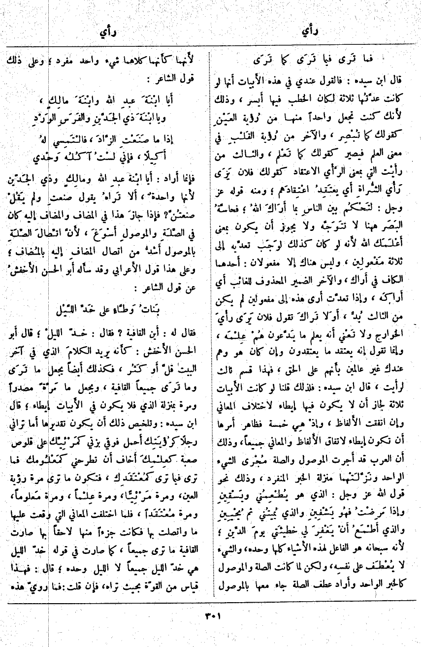 قَالَ ابْنُ سِيدَهْ: فَالْقَوْلُ عِنْدِي فِي هَذِهِ الأَبيات أَنها لَوْ كَانَتْ عدَّتُها ثَلَاثَةً لَكَانَ الْخَطْبُ فِيهَا أَيسر، وَذَلِكَ لأَنك كُنْتَ تَجْعَلُ وَاحِدًا مِنْهَا مِنْ رُؤْية العَيْنِ كَقَوْلِكَ كَمَا تُبْصِر، وَالْآخَرَ مِنْ رُؤْية القَلْبِ فِي مَعْنَى الْعِلْمِ فَيَصِيرُ كَقَوْلِكَ كَمَا تَعْلم، وَالثَّالِثَ مِنْ رأَيْت الَّتِي بِمَعْنَى الرَّأْي الِاعْتِقَادِ كَقَوْلِكَ فُلَانٌ يَرَى رَأْي الشُّراةِ أَي يعتَقِدُ اعْتِقادَهم؛ وَمِنْهُ قَوْلُهُ عَزَّ وَجَلَّ: لِتَحْكُمَ بَيْنَ النَّاسِ بِما أَراكَ اللَّهُ