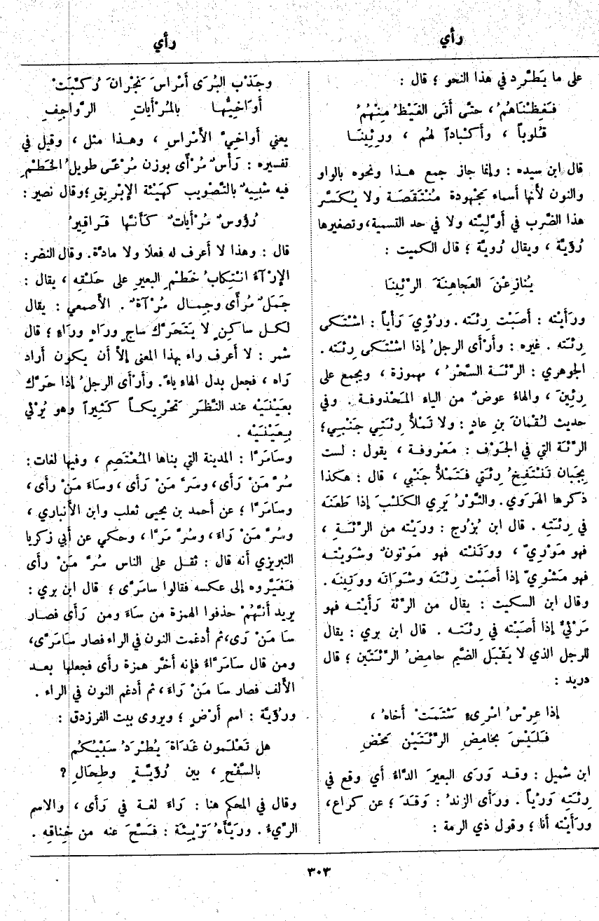 قَالَ: وَهَذَا لَا أَعرف لَهُ فِعْلًا وَلَا مادَّة. وَقَالَ النَّضْرُ: الإِرْآءُ انْتِكابُ خَطْمِ البعيرِ عَلَى حَلْقِه، يُقَالُ: جَمَلٌ مُرأىً وجِمال مُرْآةٌ. الأَصمعي: يُقَالُ لِكُلِّ ساكِنٍ لَا يَتَحَرَّك ساجٍ ورَاهٍ ورَاءٍ؛ قَالَ شَمِرٌ: لَا أَعرف رَاءً بِهَذَا الْمَعْنَى إِلَّا أَن يَكُونَ أَراد رَاه، فَجَعَلَ بَدَلَ الْهَاءِ يَاءً. وأَرْأَى الرجلُ إِذا حَرَّك بعَيْنَيْه عِنْدَ النَّظَرِ تَحْرِيكاً كَثِيراً وَهُوَ يُرْئي بِعَيْنَيْه. وسَامَرَّا: الْمَدِينَةُ الَّتِي بَنَاهَا المُعْتَصِم، وَفِيهَا لُغَاتٌ: سُرَّ مَنْ رَأَى، وسَرَّ مَنْ رَأَى، وسَاءَ مَنْ رأَى، وسَامَرَّا؛ عَنْ أَحمد بْنِ يَحْيَى ثَعْلَبٍ وَابْنِ الأَنباري، وسُرَّ مَنْ رَاءَ، وسُرَّ مَرَّا، وَحُكِيَ عَنْ أَبي زَكَرِيَّا التِّبْرِيزِيِّ أَنه قَالَ: ثَقُلَ عَلَى النَّاسِ سُرَّ مَنْ رأَى فَغَيَّروه إِلى عَكْسِهِ فَقَالُوا سامَرَّى؛ قَالَ ابْنُ بَرِّيٍّ: يُرِيدُ أَنَّهُمْ حَذَفُوا الْهَمْزَةَ مِنْ سَاءَ وَمِنْ رَأَى فَصَارَ سَا مَنْ رَى، ثُمَّ أُدغمت النُّونُ فِي الرَّاءِ فَصَارَ سَامَرَّى، وَمَنْ قَالَ سَامَرَّاءُ فإِنه أَخَّر هَمْزَةَ رأَى فَجَعَلَهَا بَعْدَ الأَلف فَصَارَ سَا مَنْ رَاءَ، ثُمَّ أَدغم النُّونَ فِي الرَّاءِ. ورُؤَيَّة: اسْمُ أَرْضٍ؛ وَيُرْوَى بَيْتُ الْفَرَزْدَقِ:
