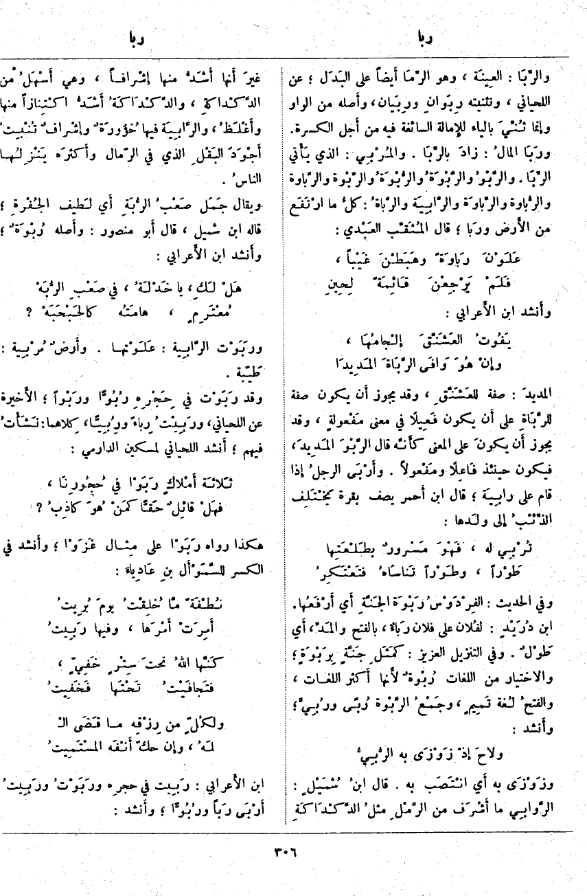 والرِّبَا: العِينَة. وَهُوَ الرِّمَا أَيضاً عَلَى البَدَل؛ عَنِ اللِّحْيَانِيِّ، وَتَثْنِيَتُهُ رِبَوانِ ورِبَيان، وأَصله مِنَ الْوَاوِ وإِنما ثُنِّيَ بِالْيَاءِ للإِمالة السَّائِغَةِ فِيهِ مِنْ أَجل الْكَسْرَةِ. ورَبَا المالُ: زادَ بالرِّبَا. والمُرْبِي: الَّذِي يَأْتي الرِّبَا. والرَّبْوُ والرَّبْوَةُ والرُّبْوَةُ والرِّبْوَة والرَّبَاوَة والرُّبَاوة والرِّبَاوَة والرَّابِيَة والرَّبَاةُ: كلُّ مَا ارْتَفَعَ مِنَ الأَرض ورَبا؛ قَالَ المُثَقِّب العَبْدي: