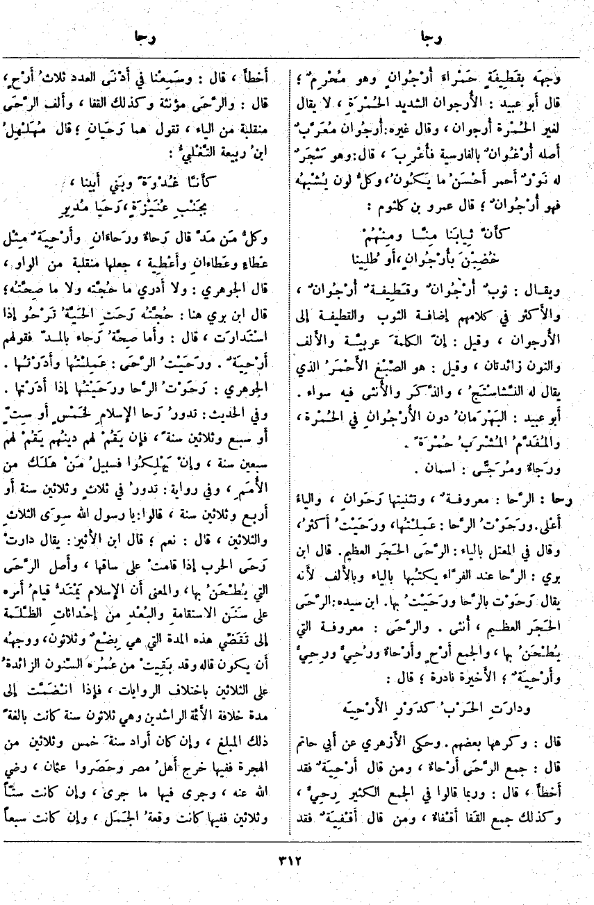 رحا: الرَّحا: معروفةٌ، وَتَثْنِيَتُهَا رَحَوانِ، والياءُ أَعْلى. ورَحَوْتُ الرَّحا: عَمِلْتُها، ورحي