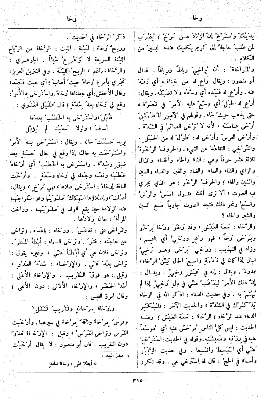 يدَيْكَ واستَرْخْ إنَّ الزِّنادَ مِنْ مَرْخْ؛ يُضْرَب لِمَنْ طلبَ حَاجَةً إِلَى كَرِيمٍ يَكْفِيكَ عِنْدَهُ اليسيرُ مِنَ الْكَلَامِ. والمُرَاخَاةُ: أَن يُراخِيَ رِبَاطًا ورِباقاً. قَالَ أَبو مَنْصُورٍ: وَيُقَالُ رَاخِ لَهُ مِنْ خِناقهِ أَي رَفِّهْ عَنْهُ. وأَرْخِ لَهُ قَيْده أَيْ وسِّعْه وَلَا تضَيِّقْه. وَيُقَالُ: أَرْخِ لَهُ الحبْلَ أَي وسِّعْ عَلَيْهِ الأَمرَ فِي تَصَرُّفه حَتَّى يَذْهَبَ حيثُ شَاءَ. وَقَوْلُهُمْ فِي الآمِنِ المُطْمَئنِّ أَرْخَى عِمامَتَه، لأَنه لَا تُرْخى العمائمُ فِي الشِّدّة. وأَرْخَى الفرسَ وأَرْخَى لَهُ: طوَّلَ لَهُ مِنَ الحبْلِ. والتَّرَاخِي: التقاعُدُ عَنِ الشَّيْءِ. والحروفُ الرِّخْوَةُ ثَلَاثَةَ عَشَرَ حَرْفًا وَهِيَ: الثاءُ وَالْحَاءُ وَالْخَاءُ وَالذَّالُ وَالزَّايُ وَالظَّاءُ وَالصَّادُ وَالضَّادُ وَالْغَيْنُ وَالْفَاءُ وَالسِّينُ وَالشِّينُ وَالْهَاءُ؛ والحرفُ الرِّخْو: هُوَ الَّذِي يَجْرِي فِيهِ الصَّوْتُ، أَلا تَرَى أَنك تَقُولُ المَسُّ والرَّشُّ والسَّحُّ وَنَحْوُ ذَلِكَ فَتَجِدُ الصَّوْتَ جَارِيًا مَعَ السِّينِ وَالشِّينِ وَالْحَاءِ؟ والرَّخَاء: سَعَة العَيْشِ، وَقَدْ رَخُوَ ورَخَا يَرْخُو ويَرْخى رَخاً، فَهُوَ راخٍ ورَخِيٌّ أَي ناعِم، وَزَادَ فِي التَّهْذِيبِ: ورَخِيَ يَرْخَى وَهُوَ رَخِيُّ الْبَالِ إِذَا كَانَ فِي نَعْمَةٍ واسِعَ الْحَالِ بَيّنُ الرَّخاء، ممدودٌ. وَيُقَالُ: إِنَّهُ فِي عَيْشٍ رخِيٍّ. وَيُقَالُ: إِنَّ ذَلِكَ الأَمرَ ليَذْهَبُ منِّي فِي بالٍ رَخِيٍّ إِذَا لَمْ يُهْتَمَّ بِهِ. وَفِي حَدِيثِ الدُّعَاءِ: