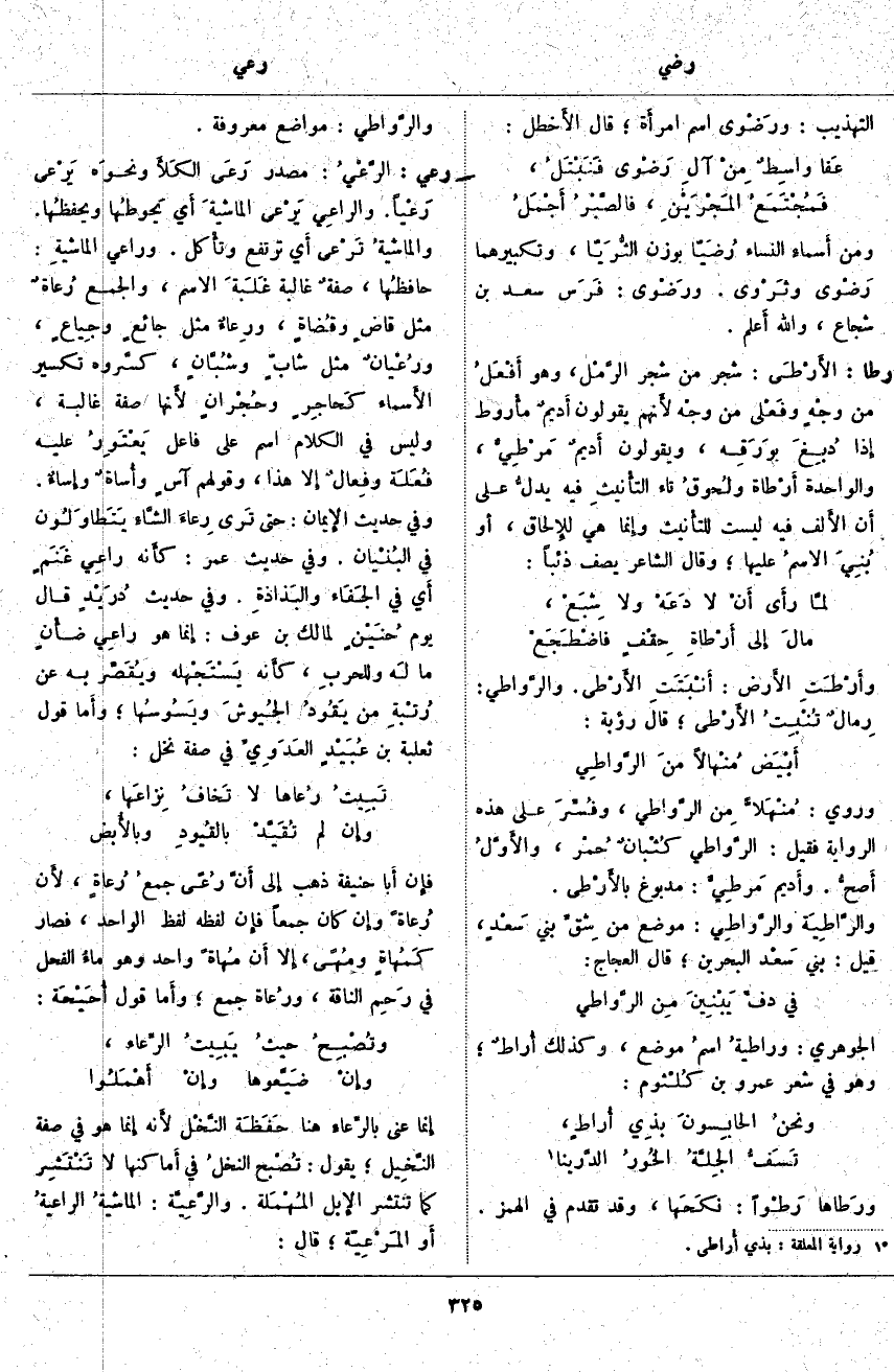 رعي: الرَّعْيُ: مَصْدَرُ رَعَى الكَلأَ ونحوَه يَرْعَى رَعْياً. والرَّاعِي يَرْعى الماشيةَ أَي يَحوطُها ويحفظُها. والماشيةُ تَرْعَى أَي تَرْتَفِعُ وتأْكل. ورَاعِي الماشيةِ: حافظُها، صفةٌ غَالِبَةٌ غلَبةَ الِاسْمِ، وَالْجَمْعُ رُعَاةٌ مِثْلُ قاضٍ وقُضاةٍ، ورِعَاءٌ مِثْلُ جائعٍ وجِياعٍ، ورُعْيانٌ مِثْلُ شَابٍّ وشُبَّانٍ، كسَّروه تَكْسِيرَ الأَسماء كَحاجِرٍ وحُجْرانٍ لأَنها صِفَةٌ غَالِبَةٌ، وَلَيْسَ فِي الْكَلَامِ اسْمٌ عَلَى فَاعِلٍ يَعْتَوِرُ عَلَيْهِ فُعَلَة وفِعالٌ إِلَّا هَذَا، وَقَوْلُهُمْ آسٍ وأُساةٌ وإساءٌ. وَفِي حَدِيثِ الإِيمان: