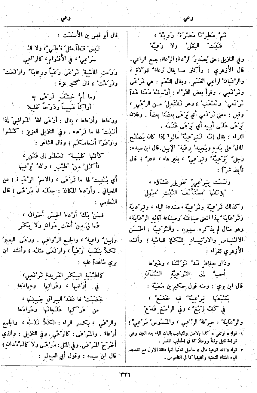 «2». ونَلْعَبْ؛ وَهُوَ نَفْتَعِلُ مِنَ الرَّعْيِ، وَقِيلَ: مَعْنَى نَرْتَعِي أَي يَرْعَى بعضُنا بَعْضًا. وَفُلَانٌ يَرْعَى عَلَى أَبِيه أَي يَرْعَى غَنَمَه. الْفَرَّاءُ: يُقَالُ إنَّه لَتِرْعِيَّةُ مالٍ «3». إِذَا كَانَ يَصْلُح المالُ عَلَى يَدِهِ ويُجِيدُ رِعْيةَ الإِبِل. قَالَ ابْنُ سِيدَهْ: رجلٌ تَرْعِيَّةٌ [تِرْعِيَّةٌ] وتِرْعِيٌّ، بِغَيْرِ هَاءٍ، نادرٌ؛ قَالَ تأَبط شَرًّا:
