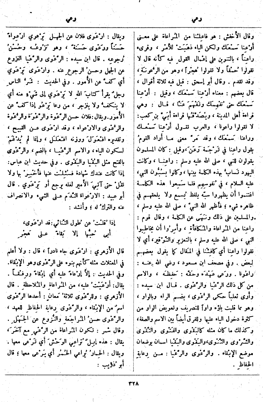 أَي إبْقاءً ورِفْقاً. يُقَالُ: أَرْعَيْتُ عَلَيْهِ، مِنَ المُرَاعَاةِ والمُلاحظةِ. قَالَ الأَزهري: وللرَّعْوَى ثلاثةُ مَعانٍ: أَحدها الرَّعْوى اسمٌ مِنَ الإِبْقاء، والرَّعْوَى رِعاية الحِفاظِ لِلْعَهْدِ، والرَّعْوى حسنُ المُراجَعةِ والنُّزوع عَنِ الجَهْلِ. وَقَالَ شَمِرٌ: تَكُونُ المُرَاعَاة مِنَ الرَّعْيِ مَعَ آخَرَ، يُقَالُ: هَذِهِ إبِلٌ تُرَاعِي الوَحْشَ أَي تَرْعى مَعَهَا. وَيُقَالُ: الحِمارُ يُراعِي الحُمُر أَي يَرْعى مَعَهَا؛ قَالَ أَبو ذُؤَيب: